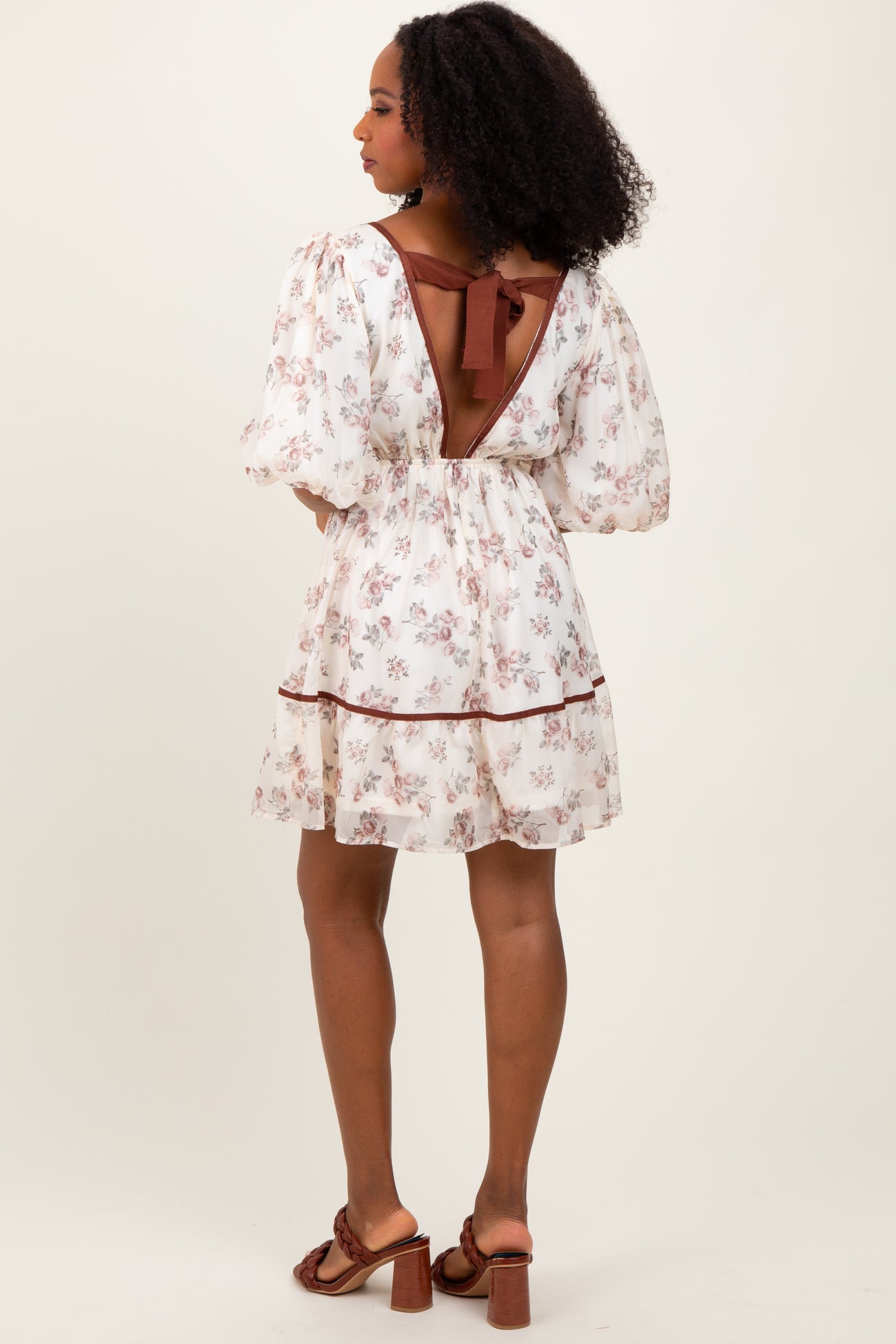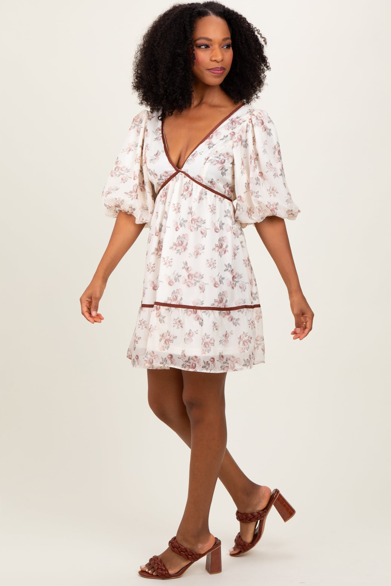 Step into effortless elegance with our Cream Floral Deep V-Neck Back Cutout Dress. This charming dress features a delicate floral print on a soft cream backdrop, perfect for spring and summer occasions. The deep V-neckline adds a touch of allure, while the feminine puff sleeves create a playful silhouette. Designed with a flattering empire waist and back cutout detail, it offers a breezy fit that moves gracefully with you. Finished with brown trim accents and a flowy hem, this dress pairs beautifully with sandals or heels for daytime brunches, garden parties, or romantic evenings. Embrace your feminine side with this must-have statement piece!