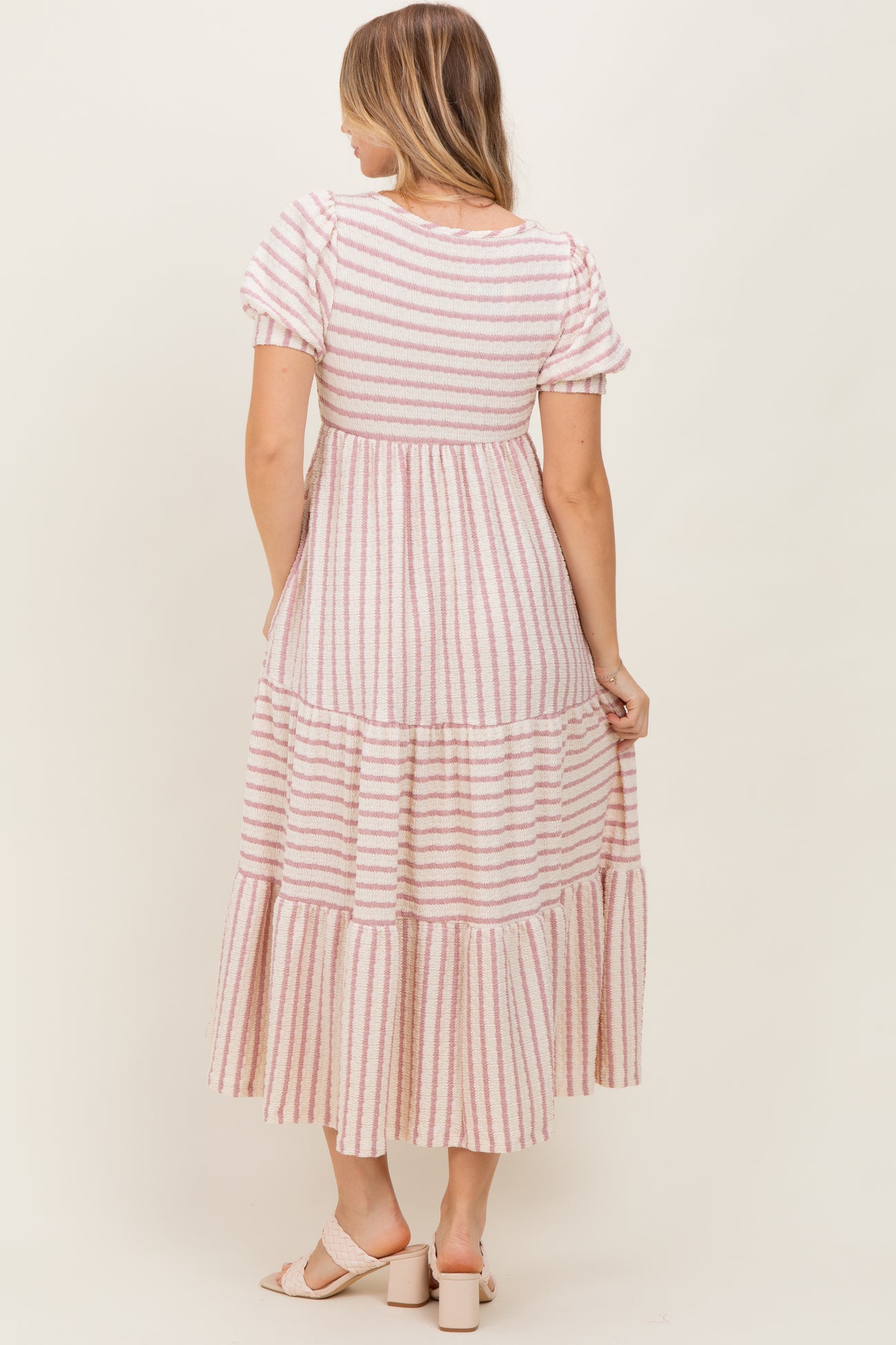 Cream/Mauve Striped Short Sleeve Tiered Maxi Dress
