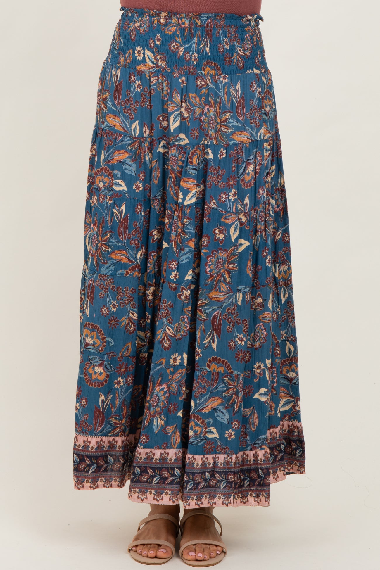 Elevate your wardrobe with our Dark Teal Smocked Waist Tiered Maxi Skirt, a perfect blend of comfort and boho-chic style. This maxi skirt features a flattering smocked waistband that hugs your waist for a secure yet flexible fit. The rich dark teal base is adorned with a vibrant, nature-inspired floral print, complementing the flowing tiered layers that add movement and grace. Lightweight and breathable, it’s ideal for warm days and effortless layering. Pair it with a tucked-in tank or blouse and sandals for a laid-back, stylish look that transitions seamlessly from casual outings to evening gatherings.