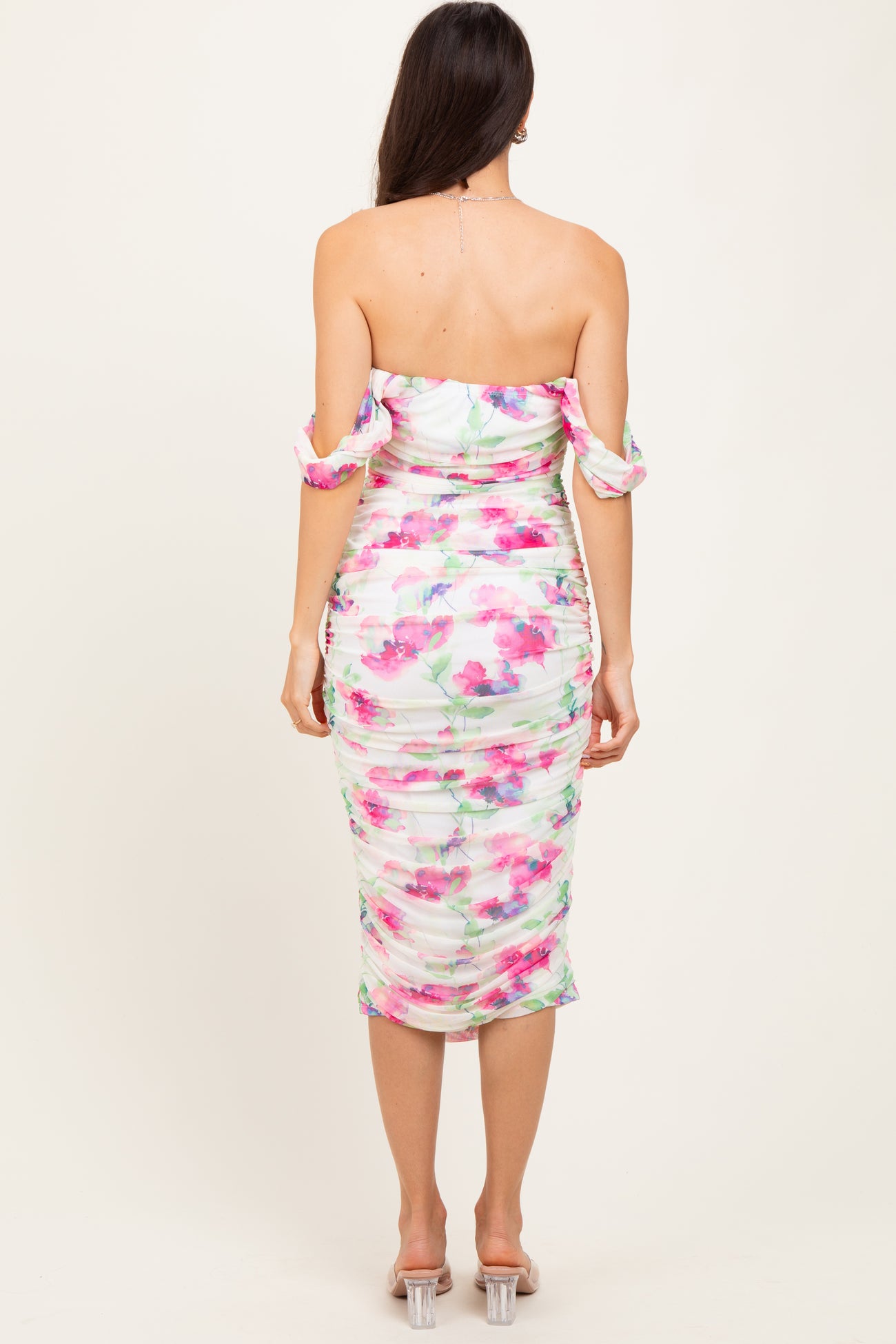 Fuchsia Floral Off Shoulder Ruched Mesh Midi Dress