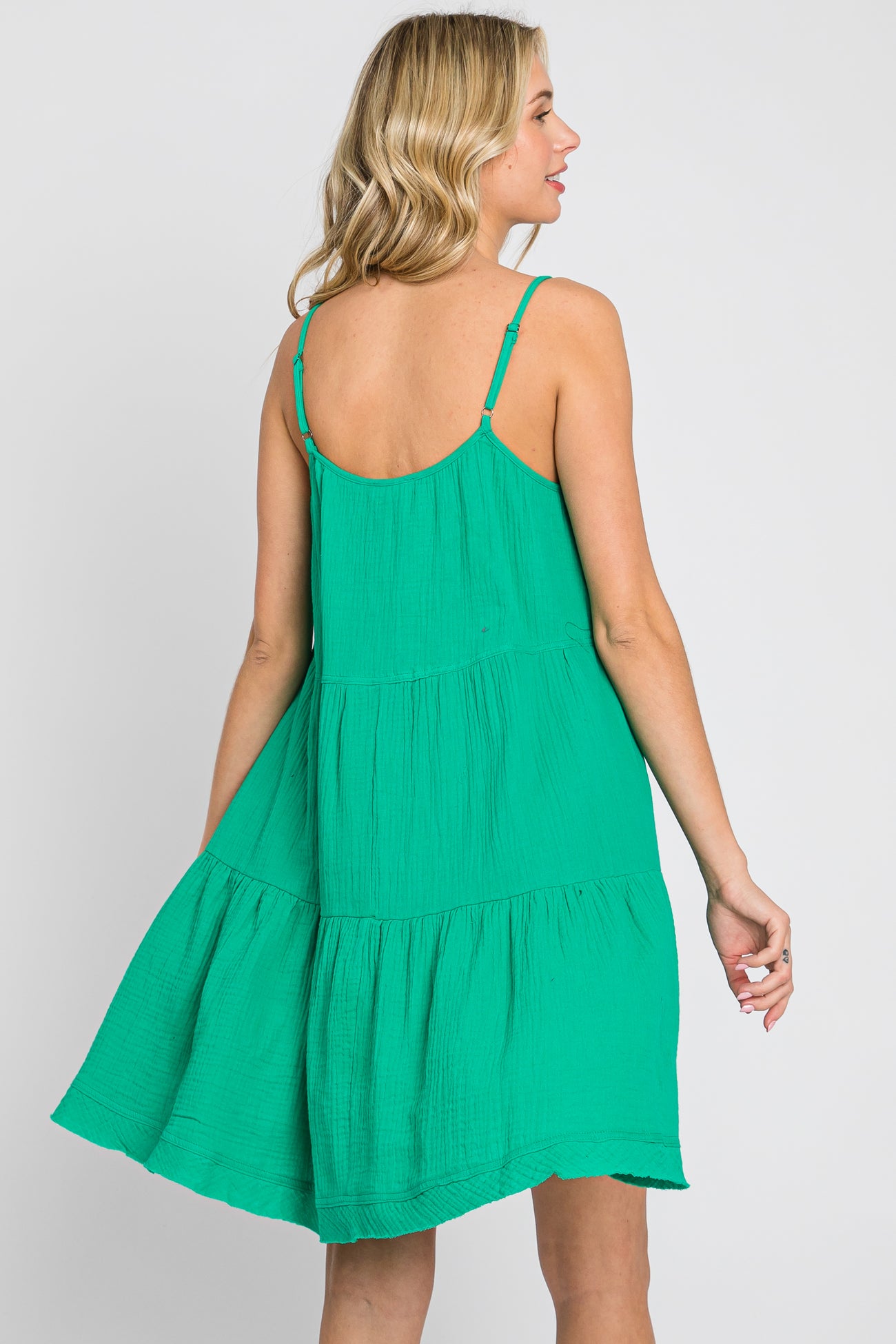 Details A lightweight gauze dress with a scoop neckline, front functioning buttons, side pockets, and a tiered skirt. Straps are adjustable. Content + Care