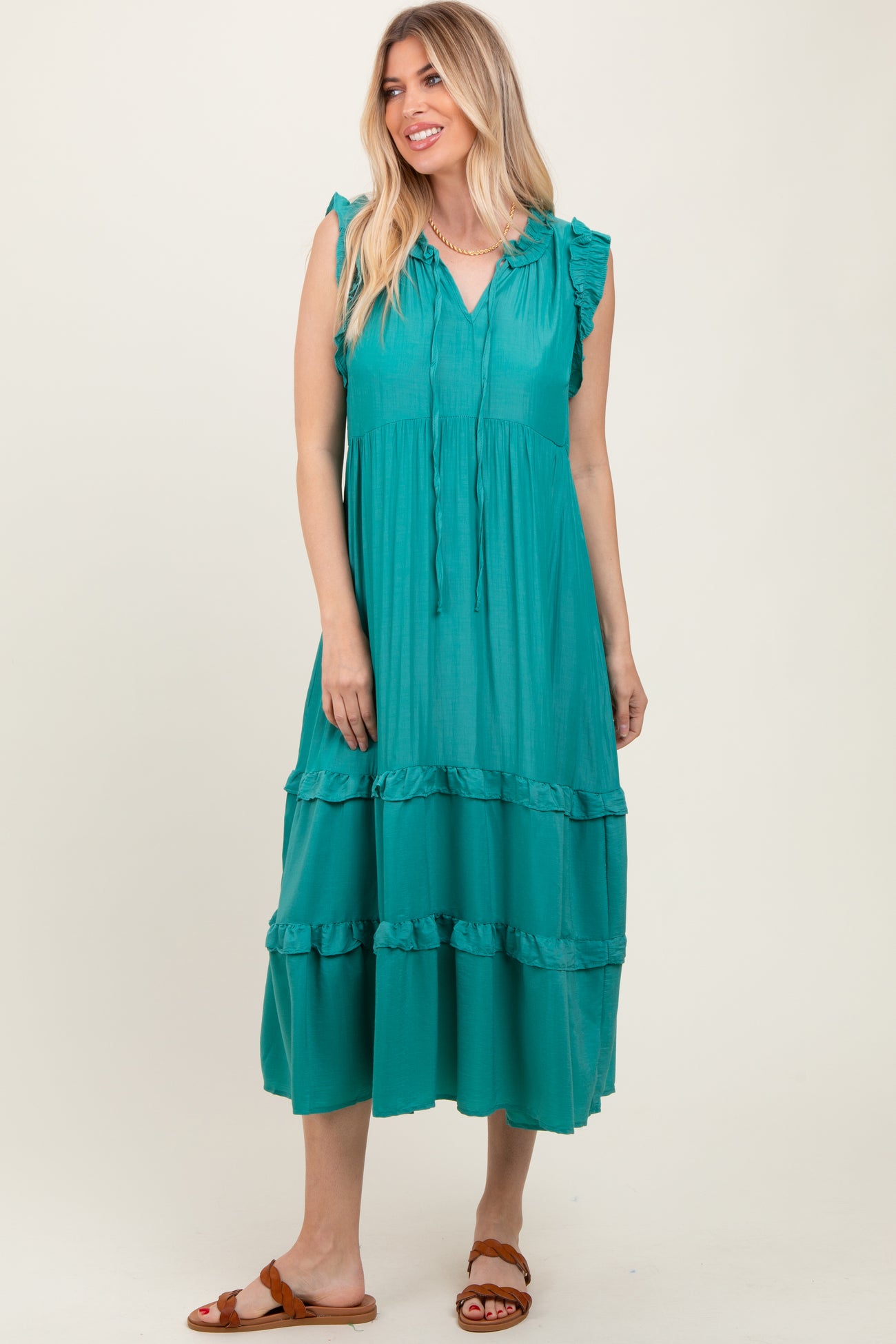 Green Ruffle Accent Tiered Front Tie Midi Dress