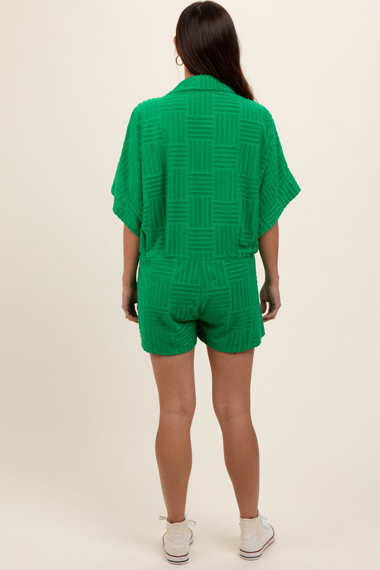 Green Textured Button Front Short Sleeve Maternity Romper
