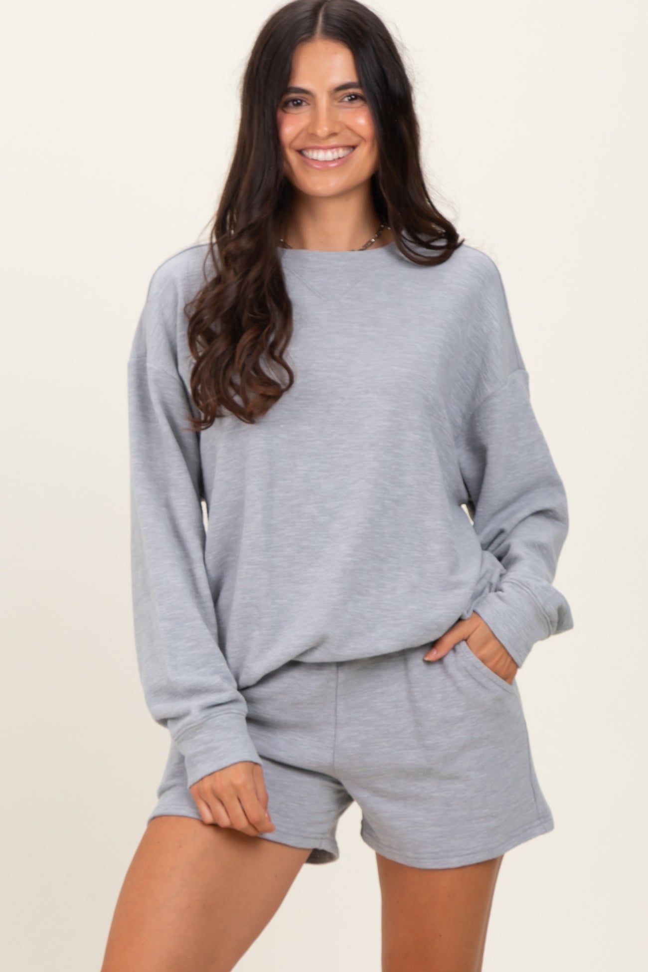 Cozy up in our Heather Grey Pullover & Shorts Set, perfect for loungewear or casual outings. This set features a relaxed-fit pullover with long sleeves and a soft crew neckline, paired with matching high-waisted shorts designed for ultimate comfort. Crafted from a breathable, lightweight fabric blend, it offers a soft touch against your skin and easy movement throughout your day. The subtle heather grey color adds a timeless, versatile look that pairs effortlessly with your favorite slippers or sneakers. Ideal for relaxing at home or running errands in style, elevate your casual wardrobe with this effortlessly chic two-piece set.
