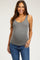 A heathered, sleeveless maternity tank top with a scoop neckline.