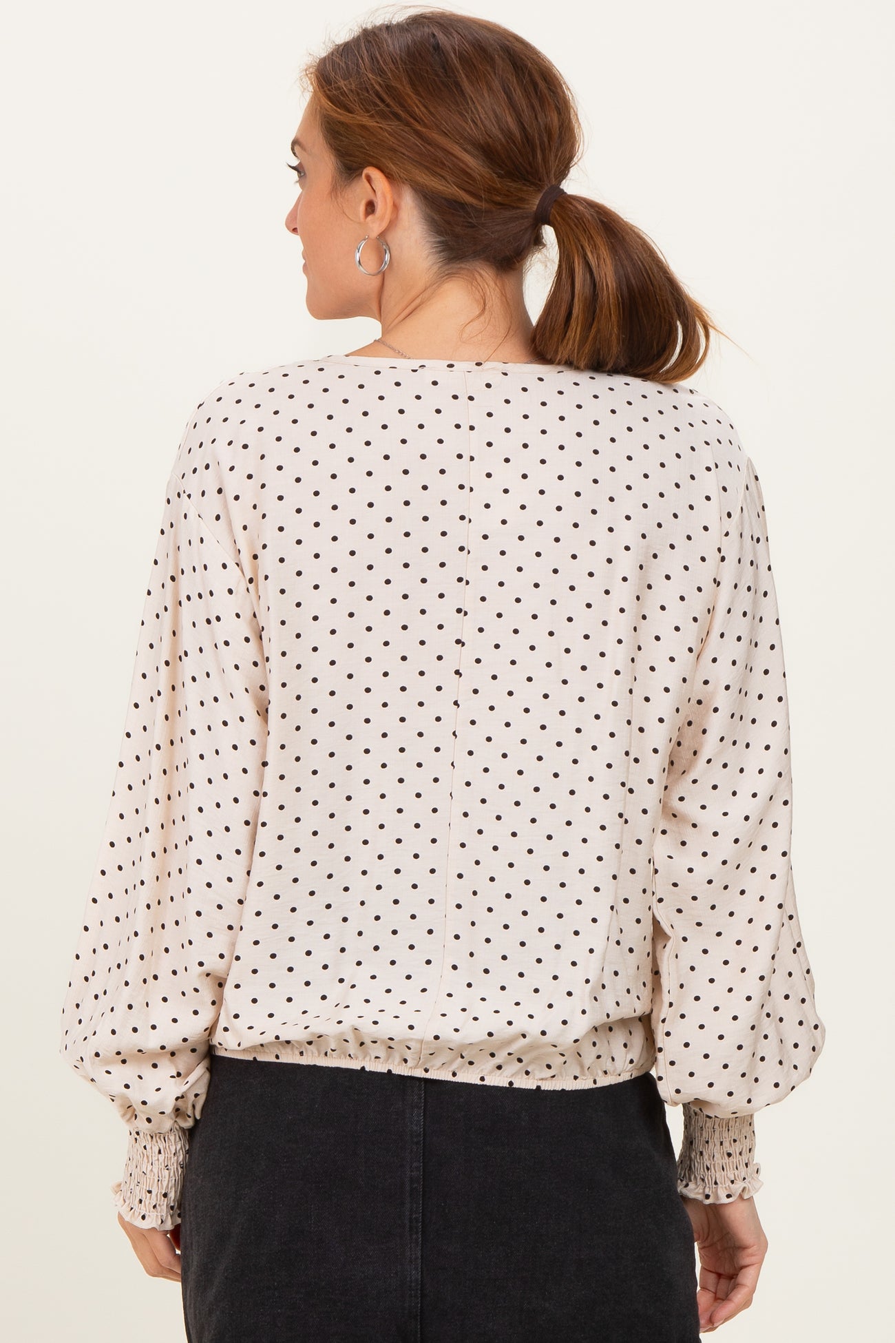 Elevate your wardrobe with this Ivory Polka Dot Long Sleeve Smocked Top, a chic blend of classic and modern style. Featuring a delicate ivory base adorned with timeless black polka dots, this top offers a flattering V-neckline and a stylish wrap front. The long sleeves end in smocked cuffs, adding a touch of elegance and a snug fit. The smocked hemline enhances the silhouette while providing comfort and versatility. Perfect for pairing with skirts, jeans, or tailored pants, this lightweight top transitions effortlessly from day to night. Embrace feminine charm and contemporary flair with this must-have piece!