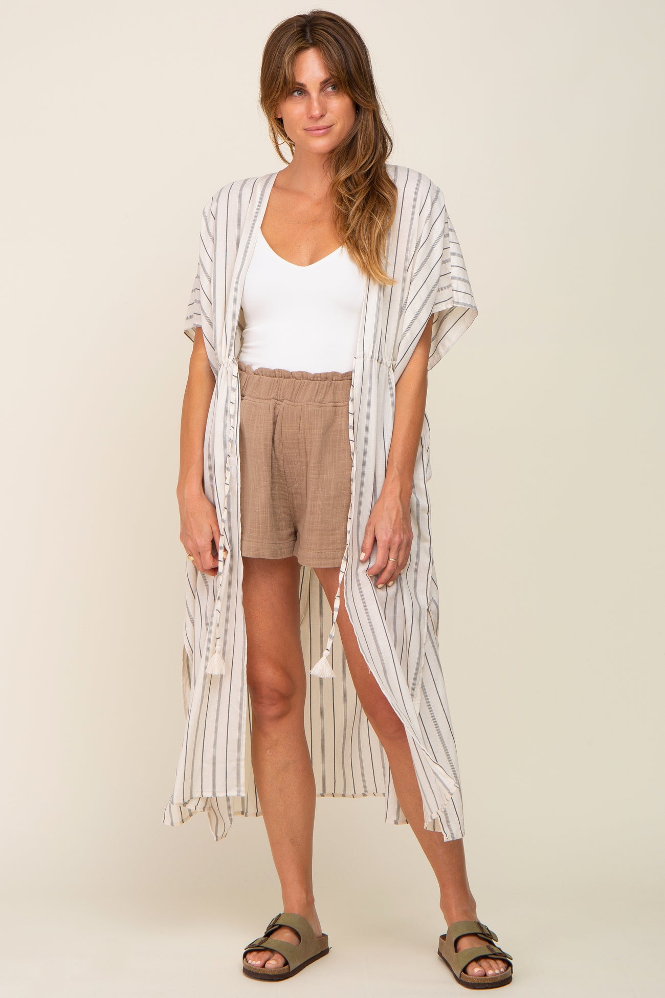 Ivory Striped Side Slit Tassel Tie Cover-Up