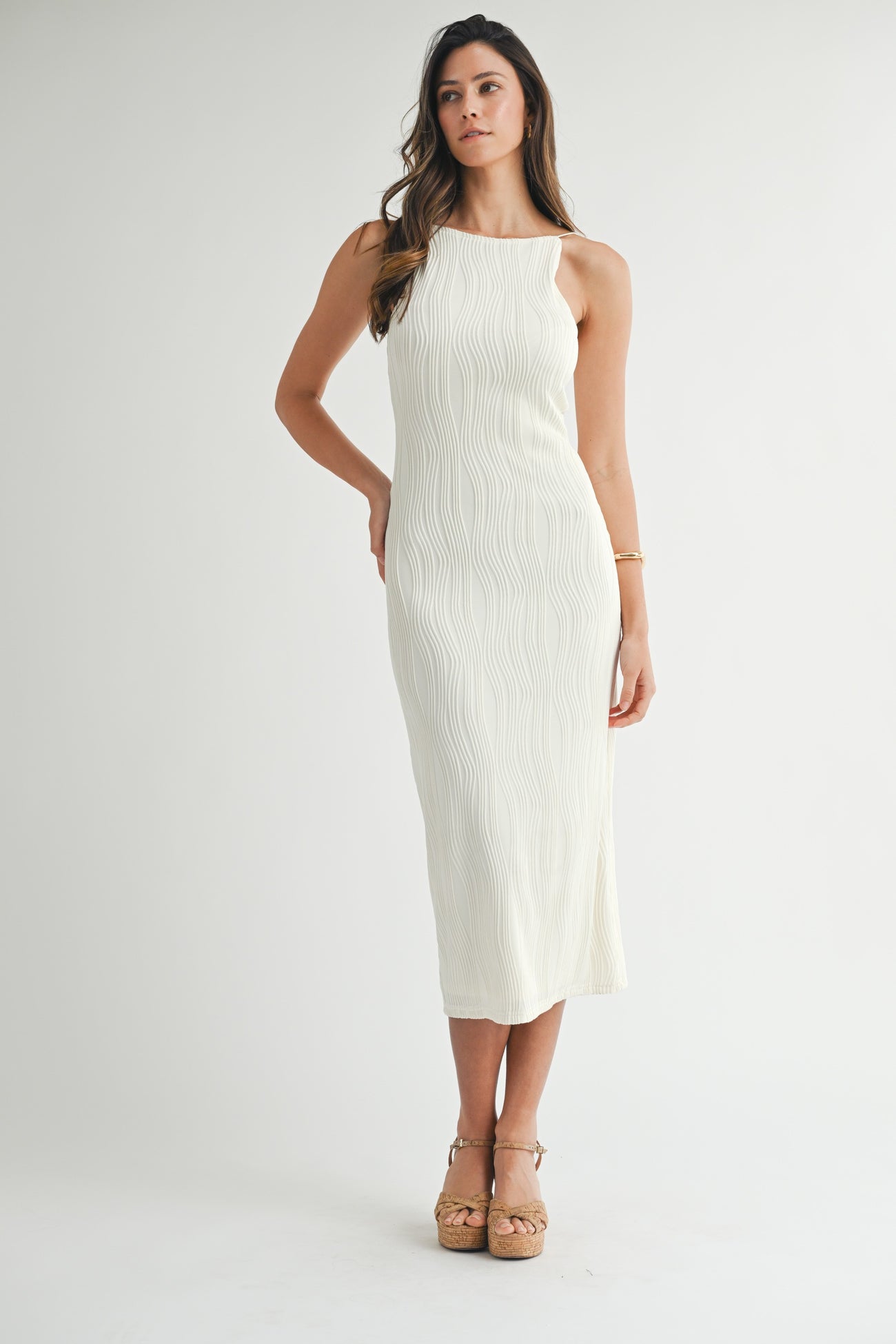 Ivory Textured Sleeveless Fitted Midi Dress