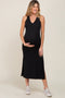 An ultra-soft knit maternity midi dress featuring a boat neckline, short sleeves, a tie at the waist, ruched sides with side slits and fully double lined.