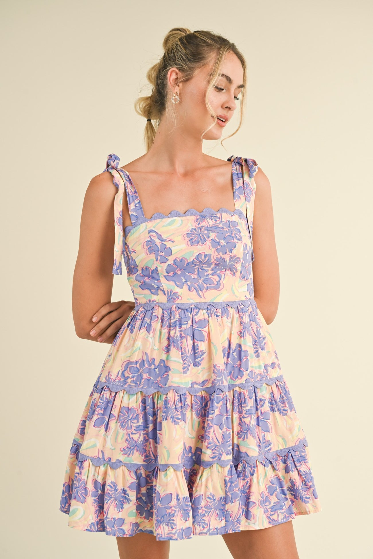 Lavender Nude Floral Tiered Scallop Trim Mini Dress