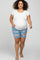 Details A pair of maternity plus shorts with heavy distressing, five pockets, and a fringed hem. Content + Care