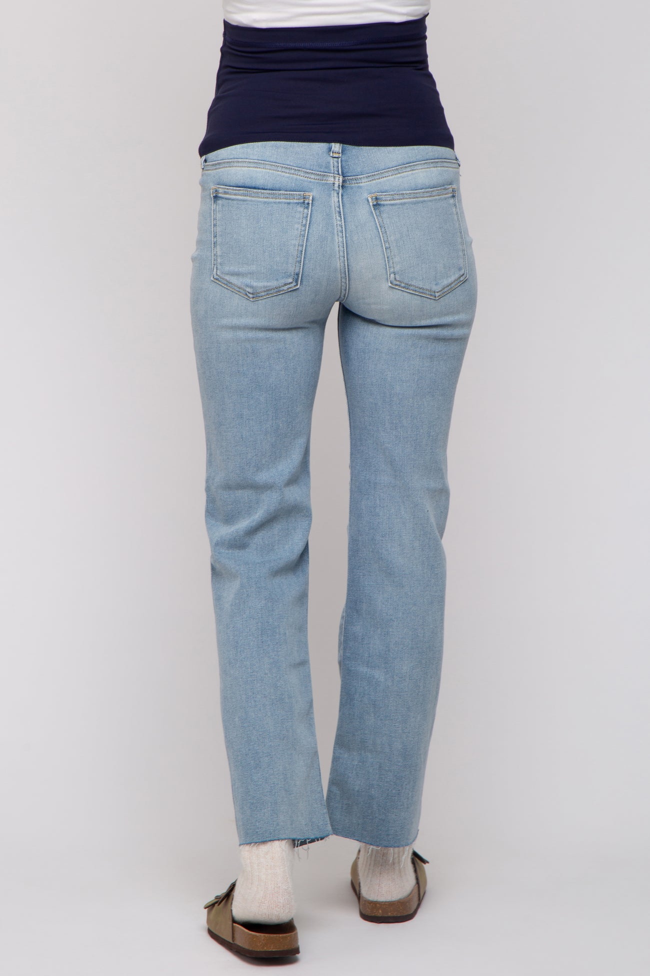 A pair of light washed maternity jeans with 5 pockets, distressed knees, an elastic belly band, and a raw hem.
