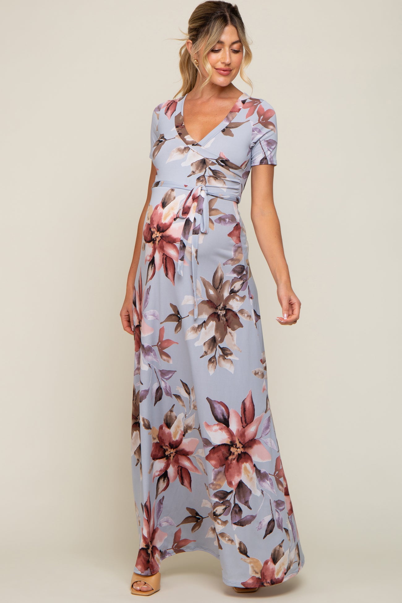 A floral print short sleeve maternity wrap dress. Includes crossover neckline and sash tie at waist.