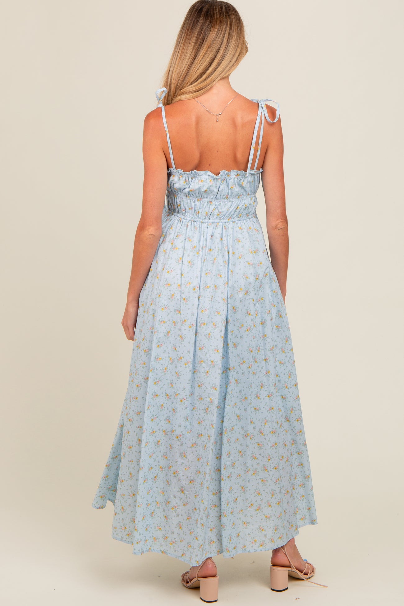 Light Blue Floral Ruched Bust Shoulder Tie Maternity Maxi Dress