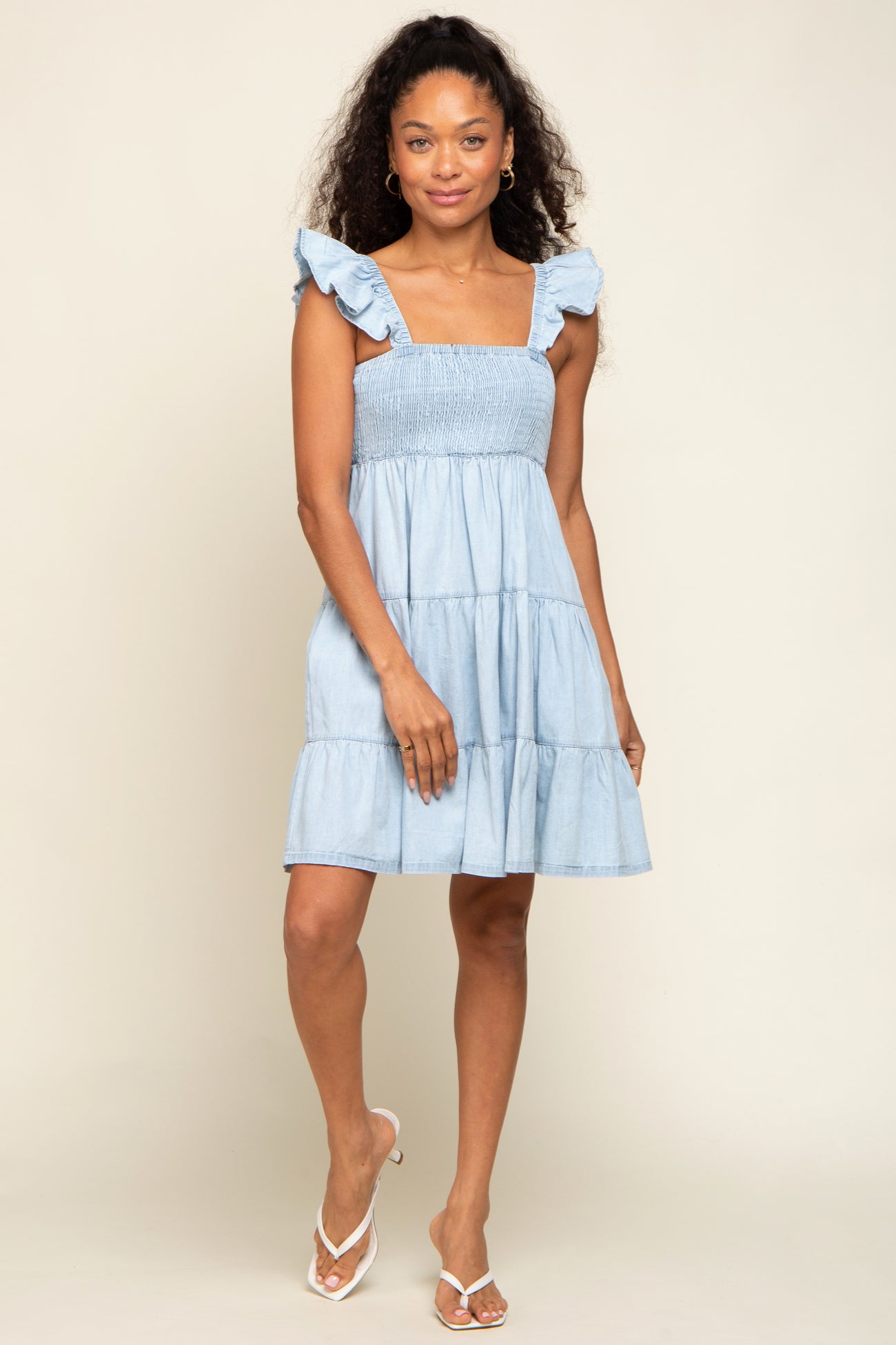 Details A sleeveless dress featuring ruffle shoulder straps, a smocked top, side pockets and a tiered skirt. Content + Care