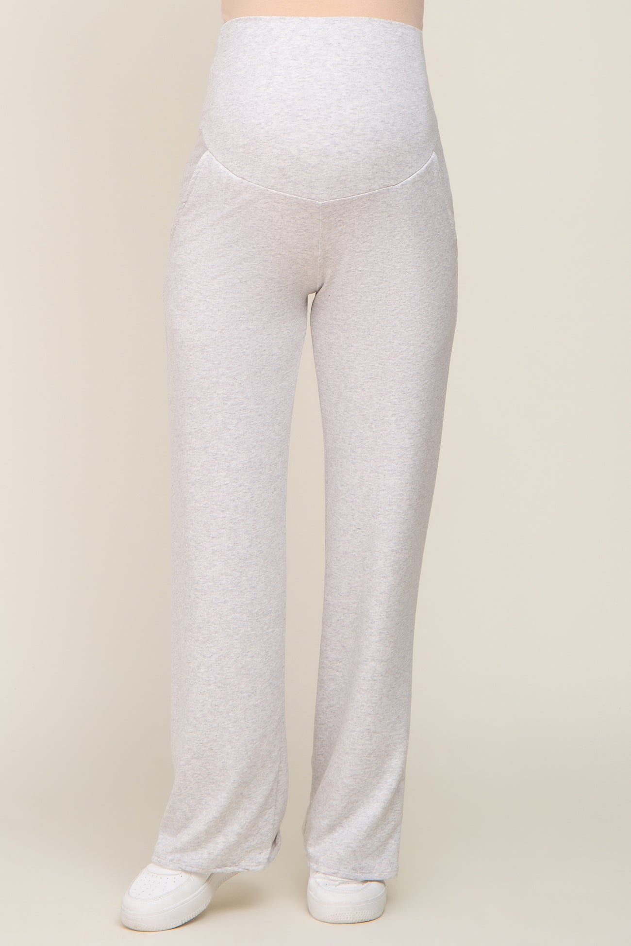 A pair of solid maternity yoga pants featuring side pockets and a bellyband.