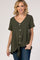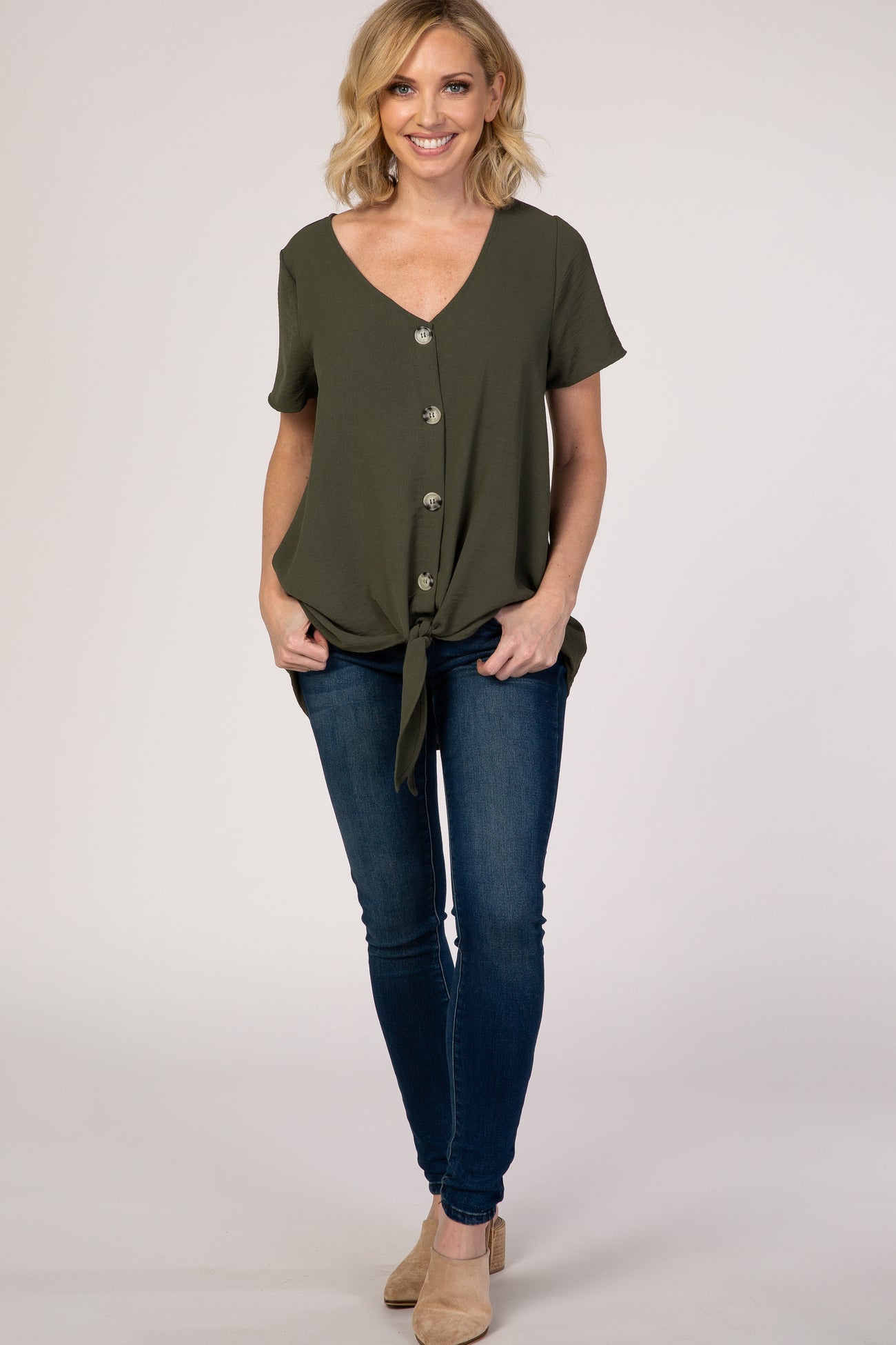 A solid hued top featuring a button accent on front, a tie accent on hemline, a v-neckline, and short sleeves.