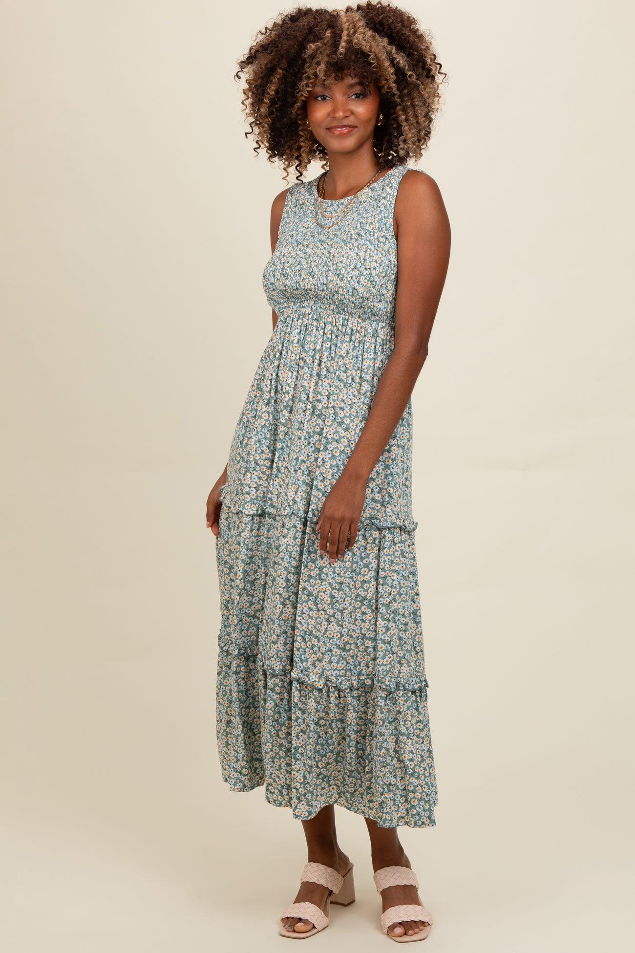 Light Olive Floral Sleeveless Ruffle Tiered Maxi Dress