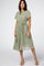 A leaf print midi dress featuring short flounce sleeves, a back button closure, an elastic waist, a pleated skirt, and a waist tie. Dress is lined to prevent sheerness.