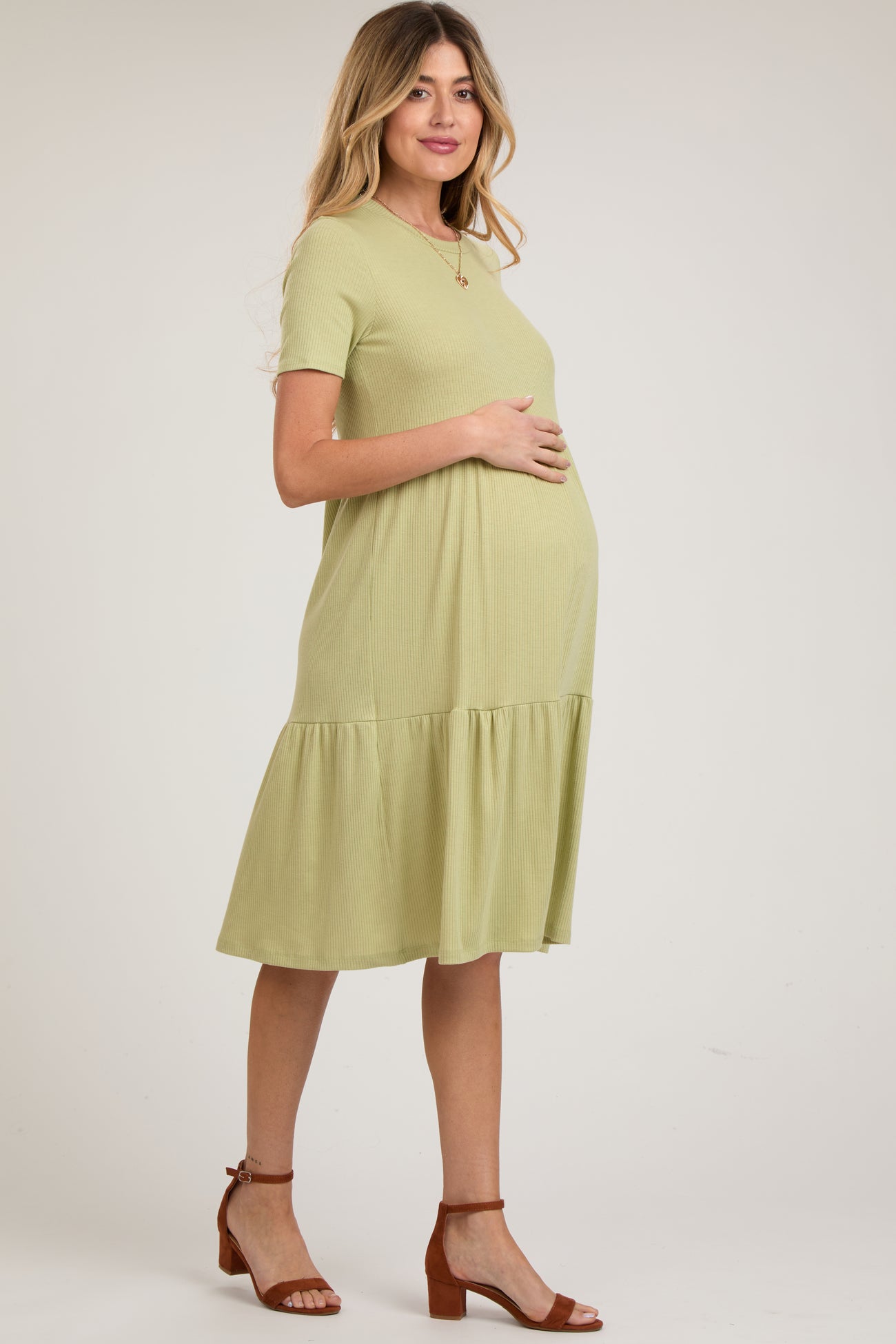 Light Olive Ribbed Tiered Maternity Midi Dress