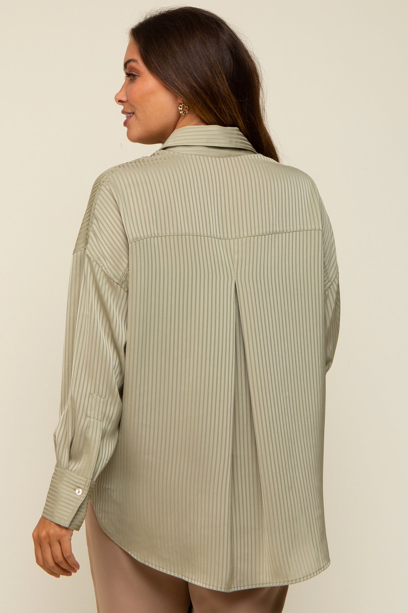 Details A solid striped long sleeve button down maternity top with collared neckline. Content + Care