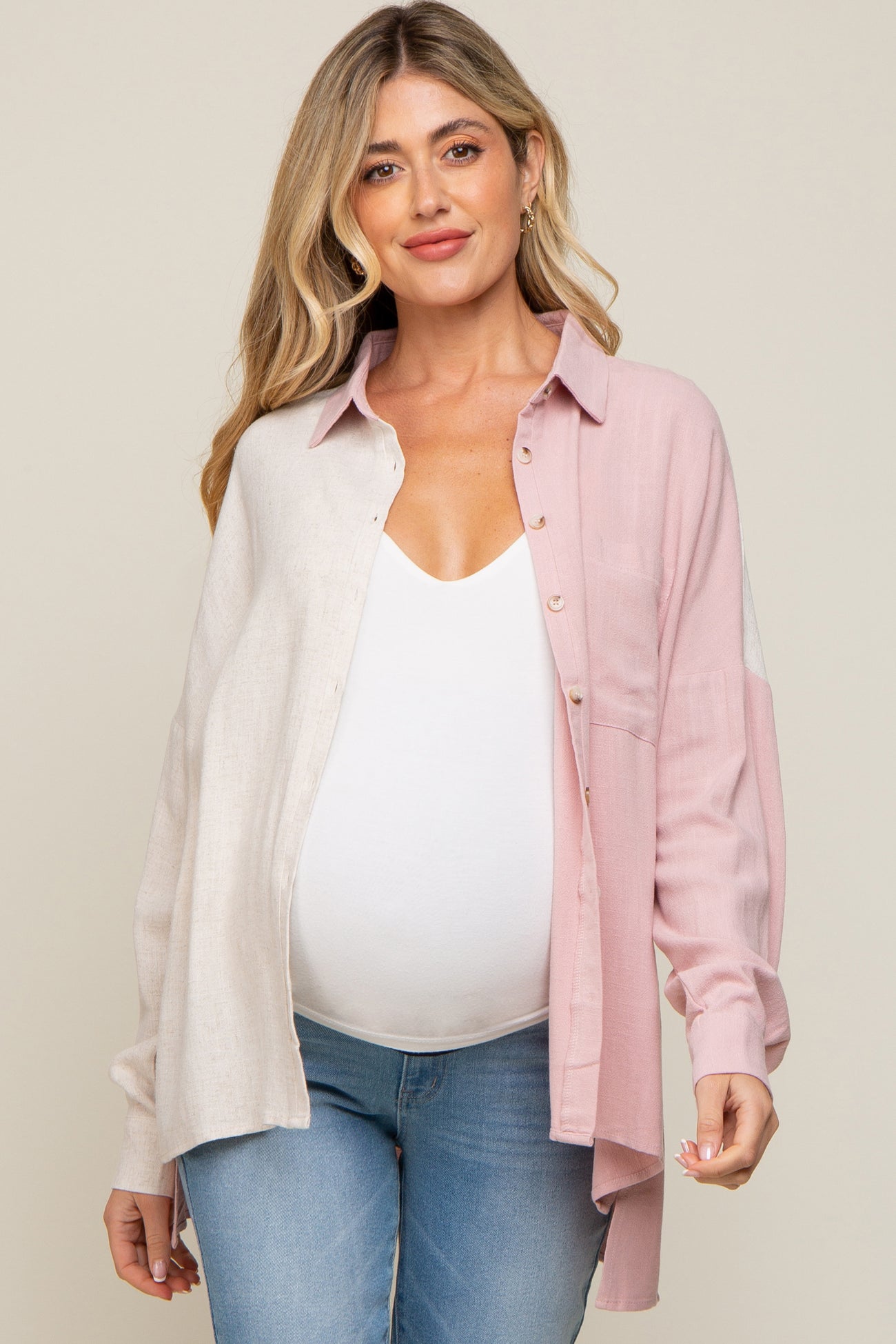Light Pink Color Block Button Up Linen Maternity Top