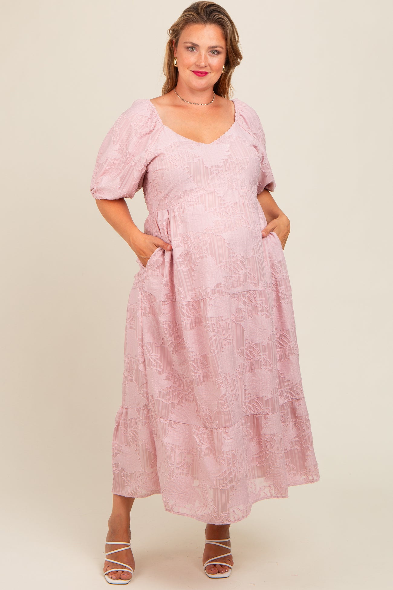 Light Pink Embroidered Leaf Print Striped Maternity Plus Maxi Dress
