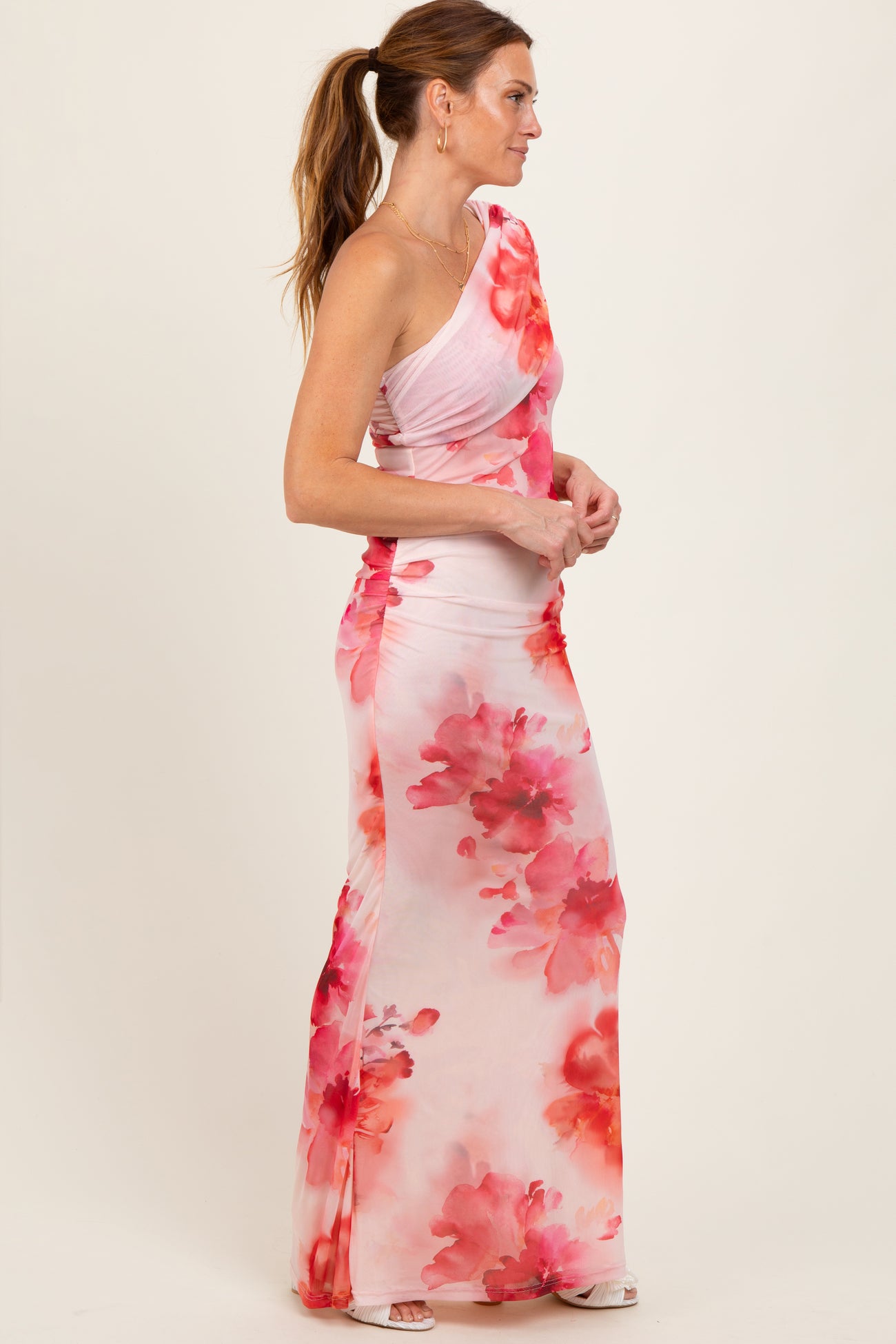 Light Pink Floral One Shoulder Ruched Maxi Dress
