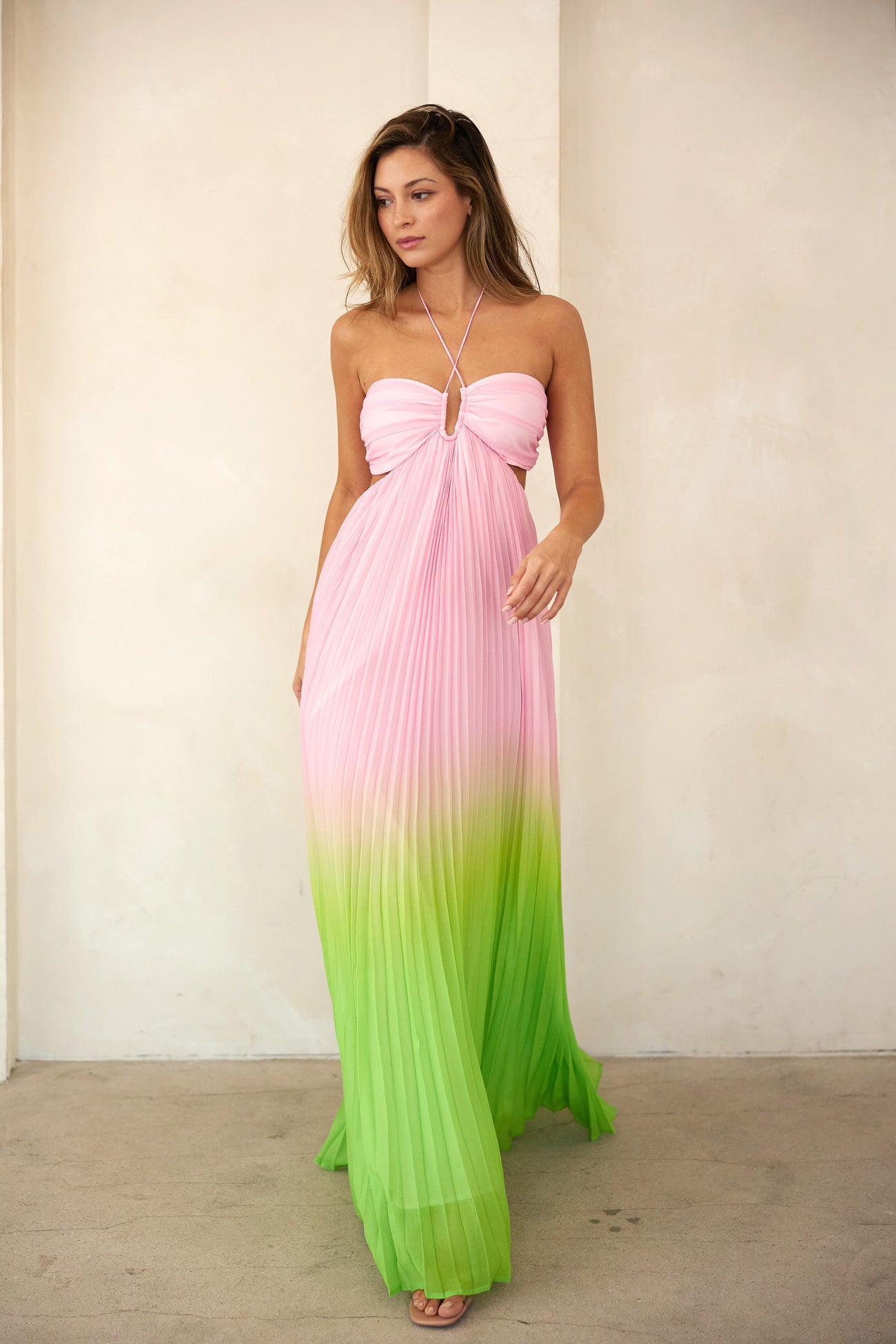 Light Pink Ombre Pleated Halter Cutout Maxi Dress