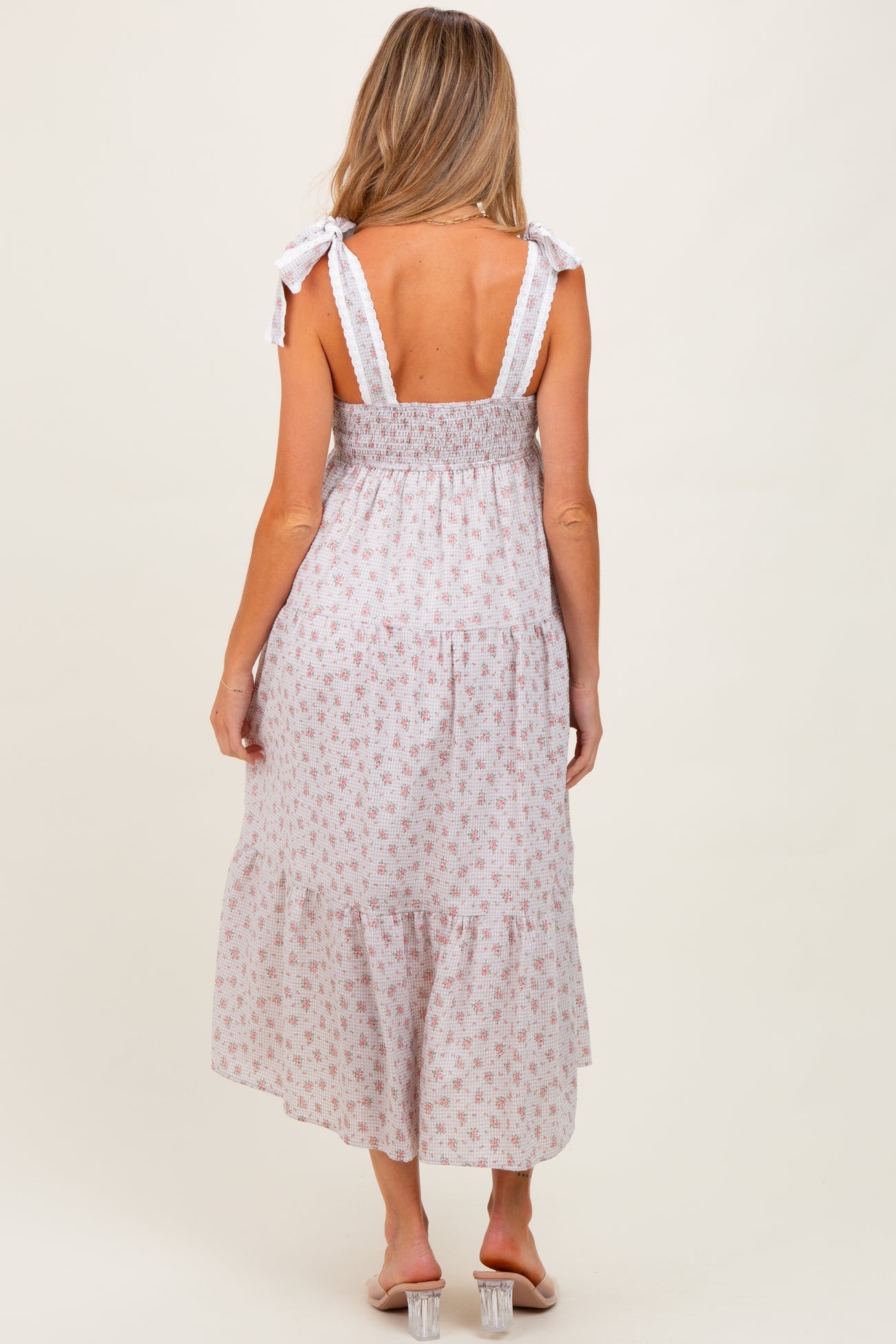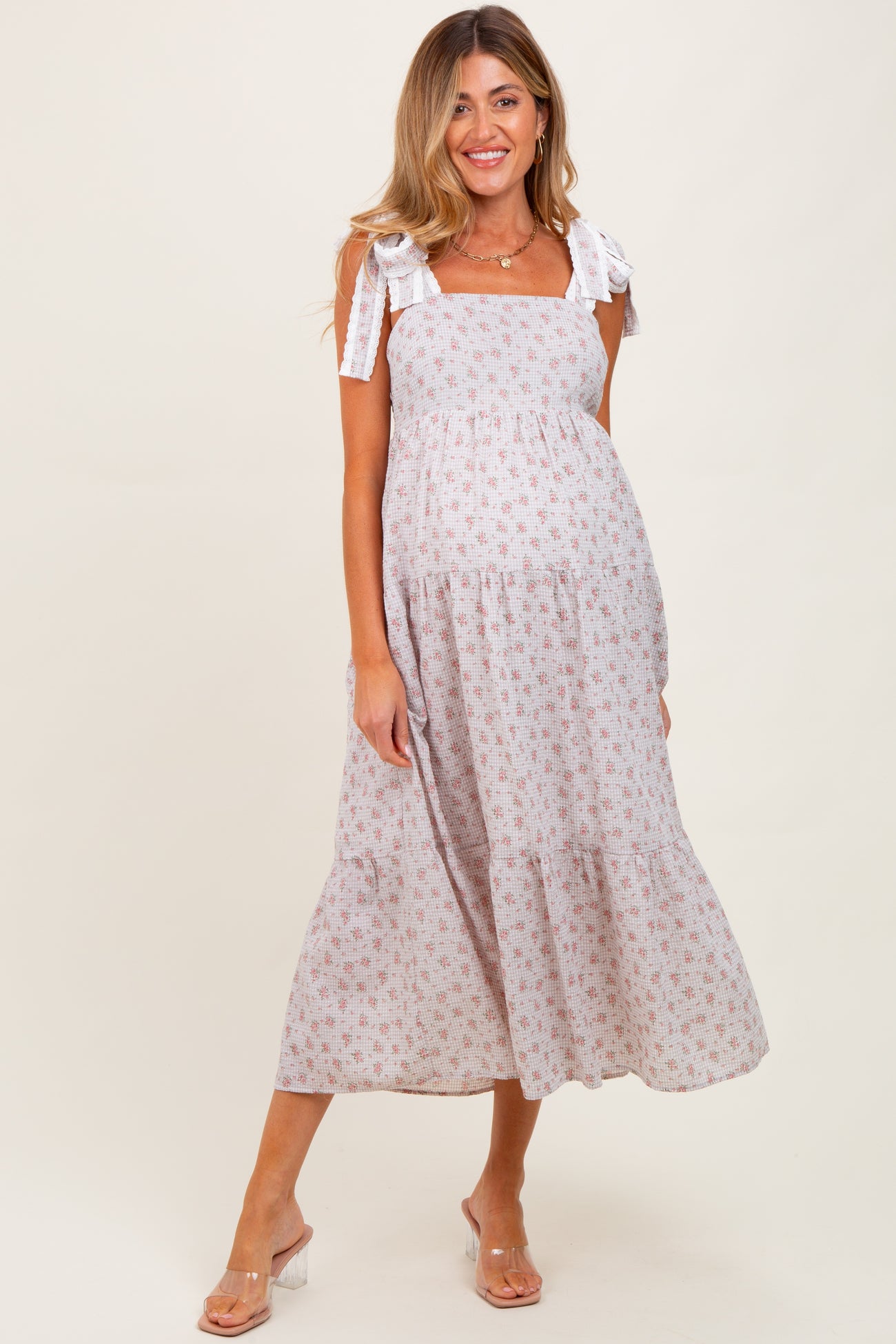 Light Taupe Floral Gingham Shoulder Tie Maternity Midi Dress