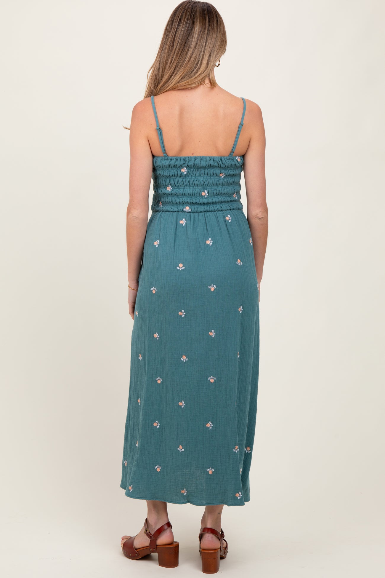Light Teal Embroidered Floral Smocked Maternity Midi Dress