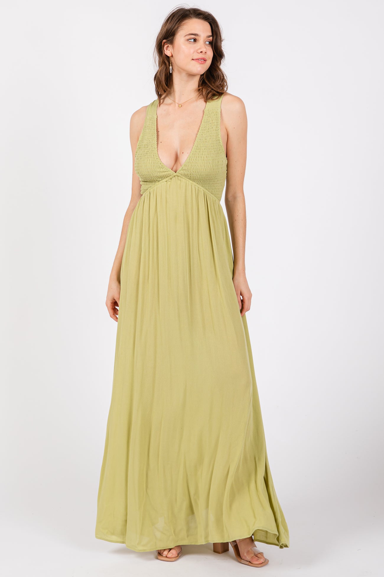 Details A solid maternity maxi dress featuring a smoked top, deep v-neckline, criss cross adjustable back ties, side pockets, and an open back. Content + Care