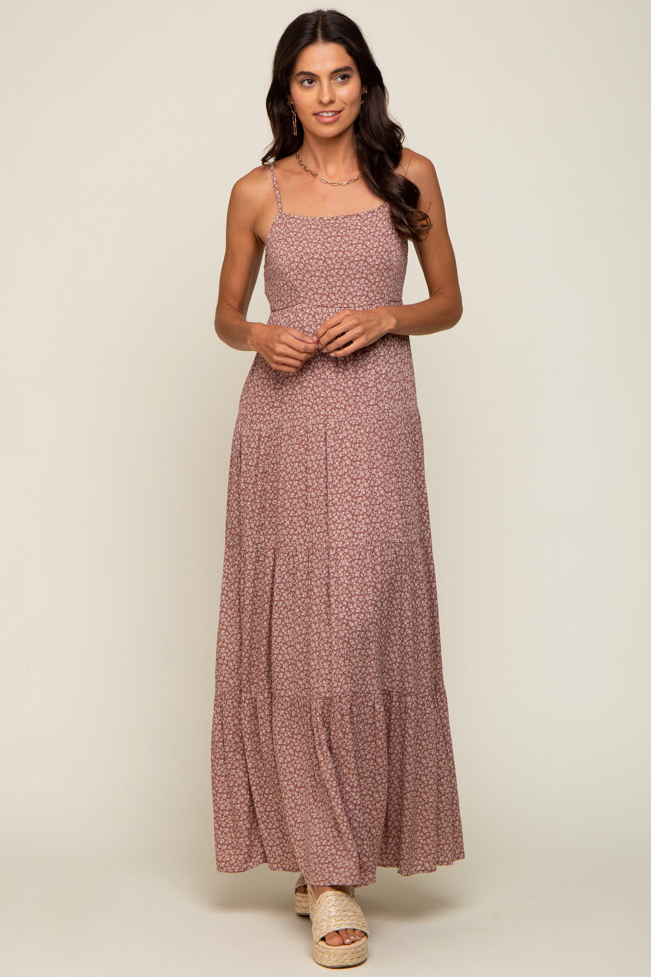 A ditsy floral maternity maxi dress with a straight neckline, adjustable straps, a back zipper closure, and a tiered skirt. Dress is partially lined.