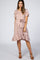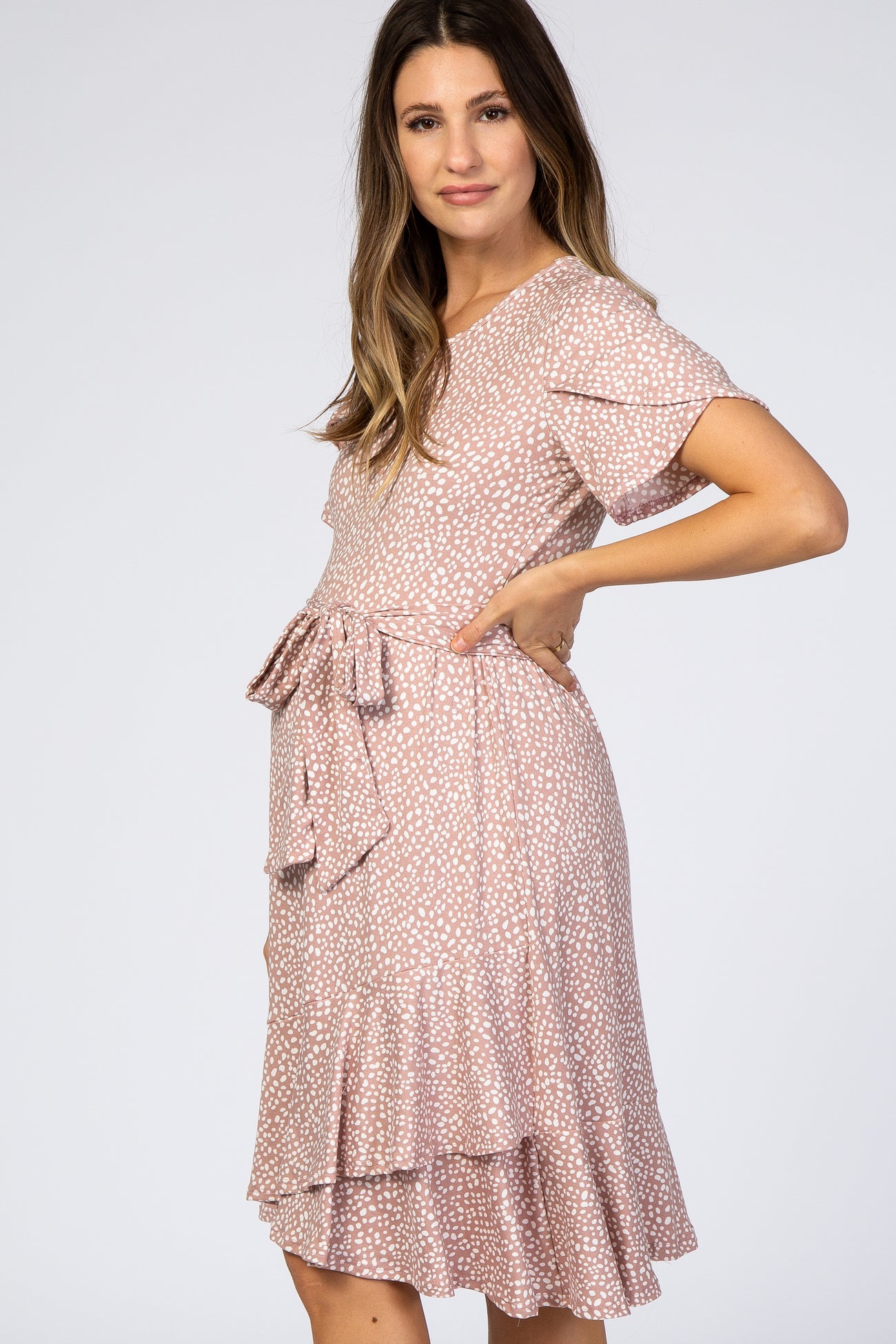 Details A polka dot printed maternity dress with short sleeves, a sash tie waist, and a ruffle detail hemline. Content + Care