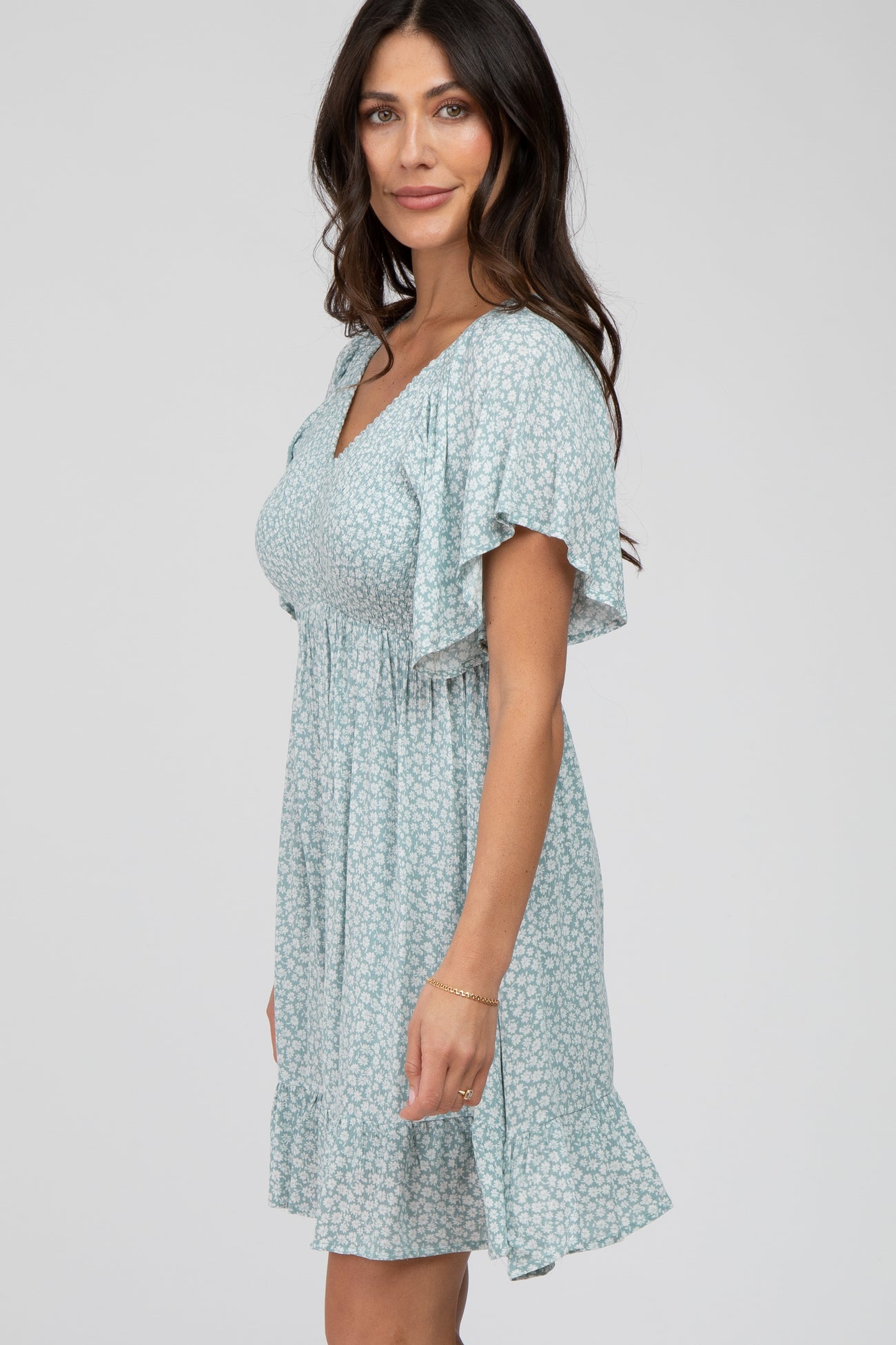 Details A floral print short dress with a smocked bust, v-neckline, and ruffle sleeves and hemline. Dress is partially lined. Content + Care