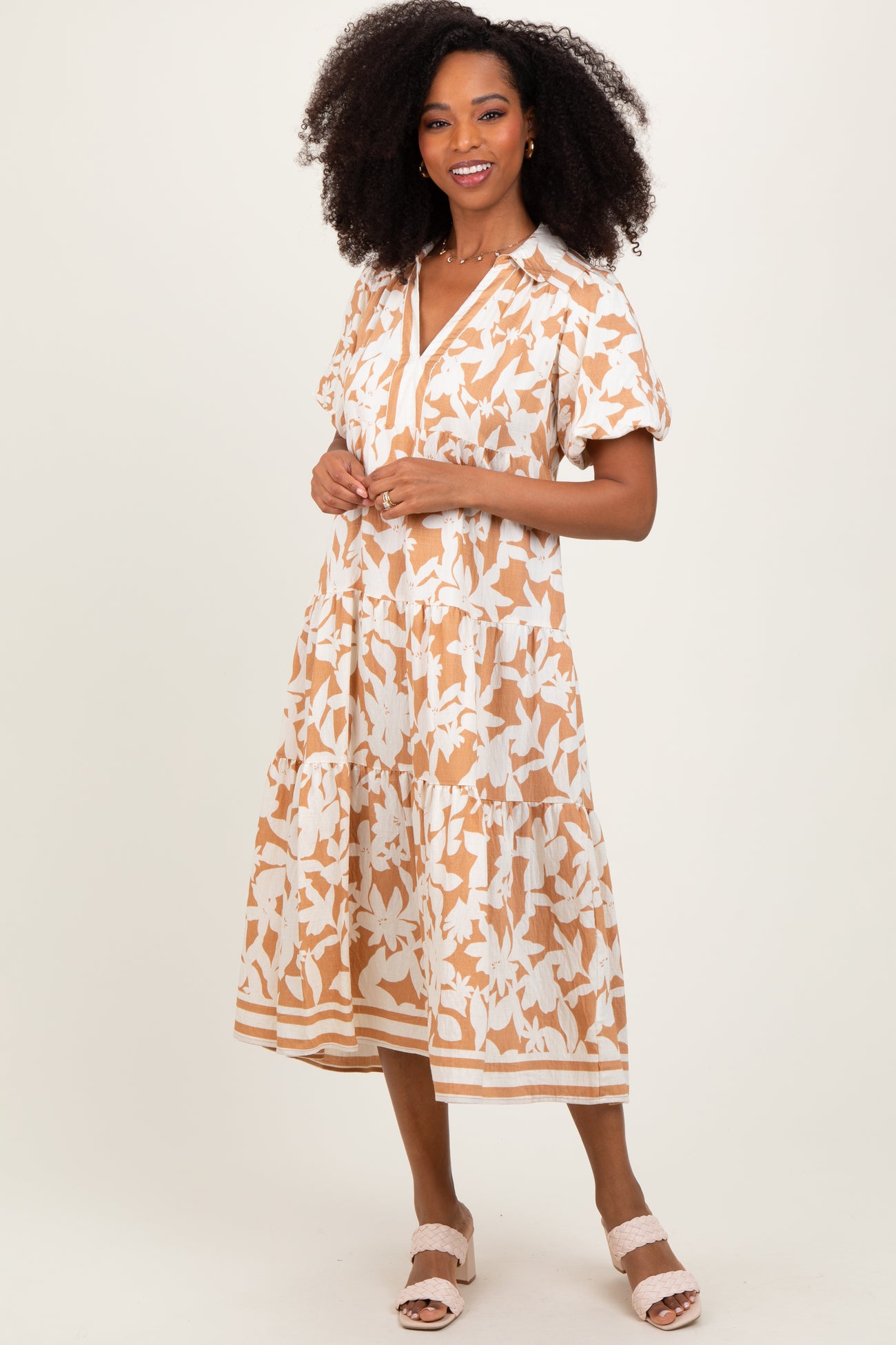 Mocha Botanical Print A Line Tiered Maternity Dress
