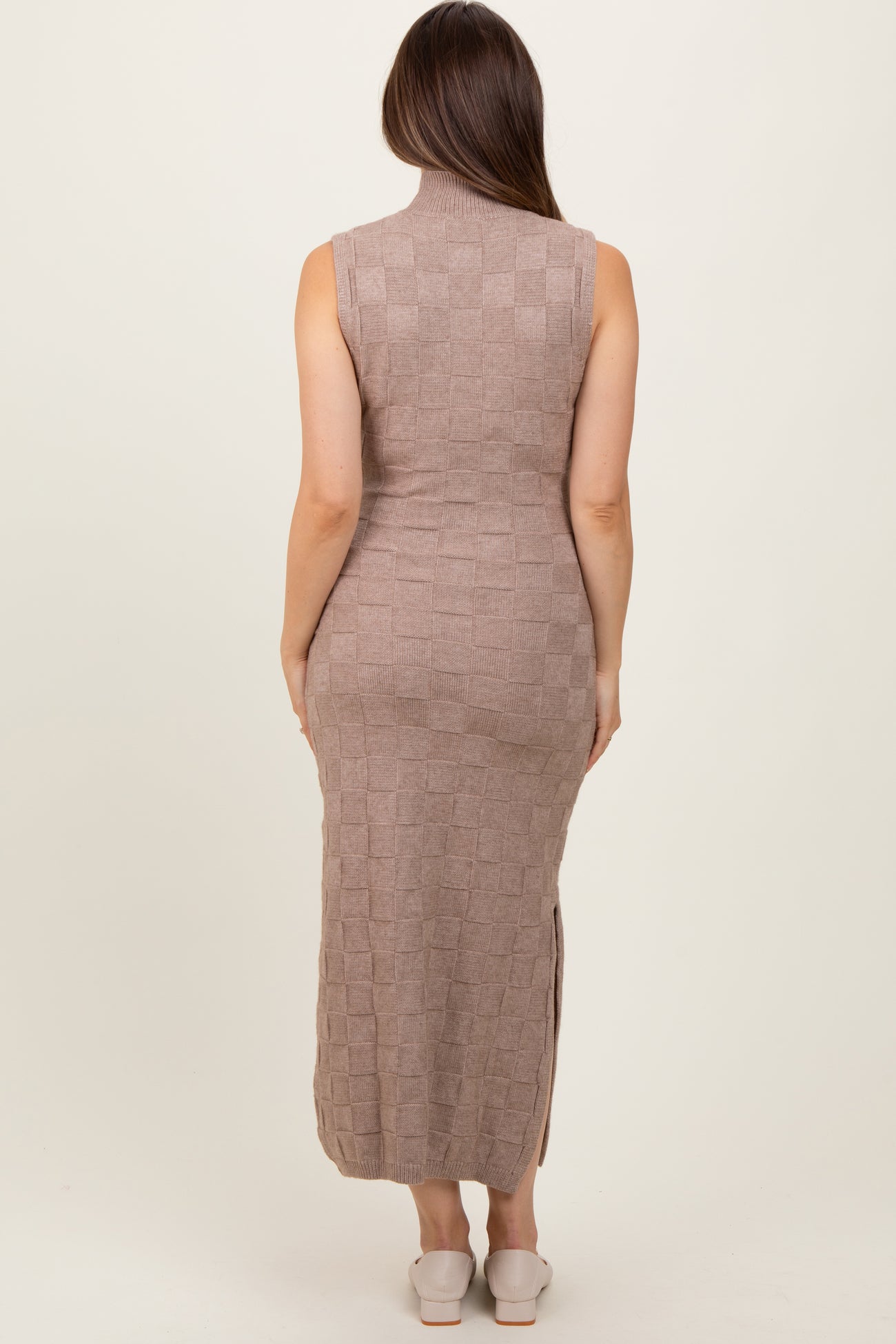 Mocha Checkered Knit Mock Neck Side Slit Maternity Maxi Dress