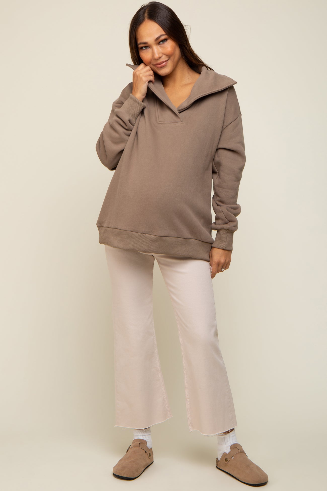 Details A solid hued maternity pullover featuring long sleeves and a collared v-neckline. Content + Care
