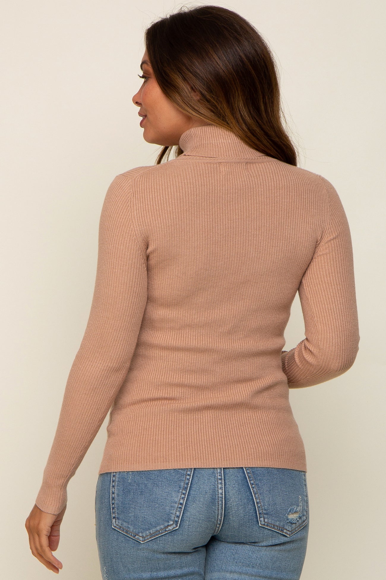A ribbed fitted maternity top featuring long sleeves and a mock neckline.