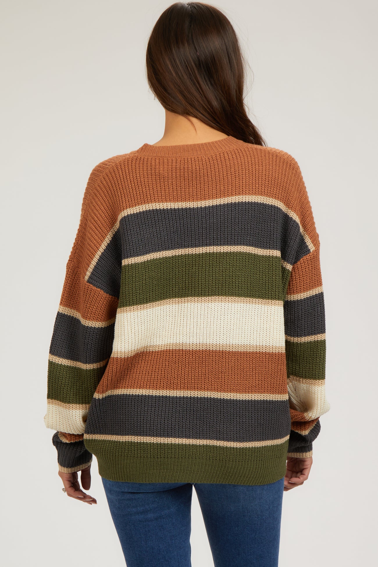 A striped multi-color maternity sweater featuring a rounded neckline and long sleeves.