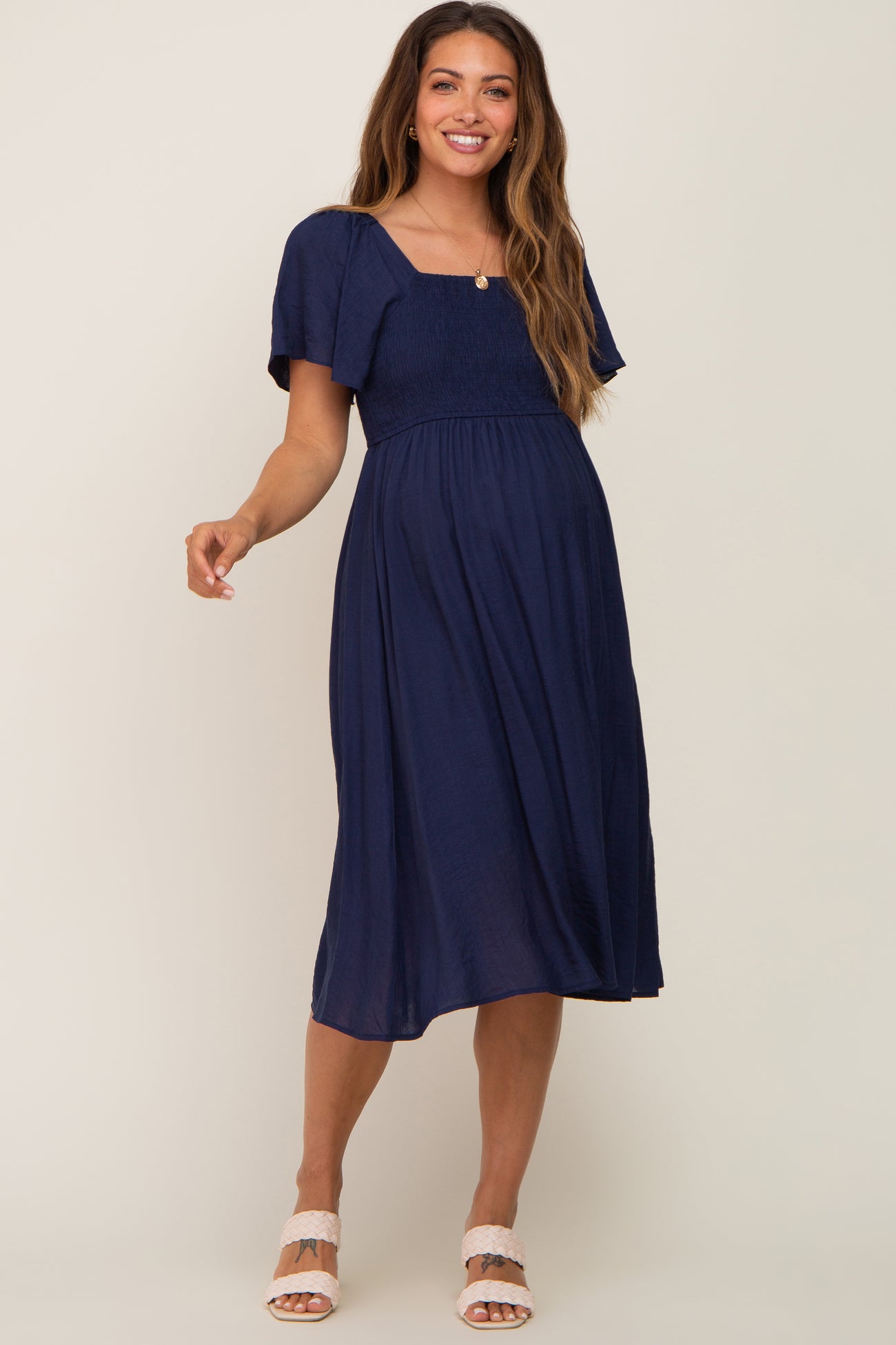 Navy Blue Smocked Square Neck Flutter Short Sleeve Maternity Midi Dress