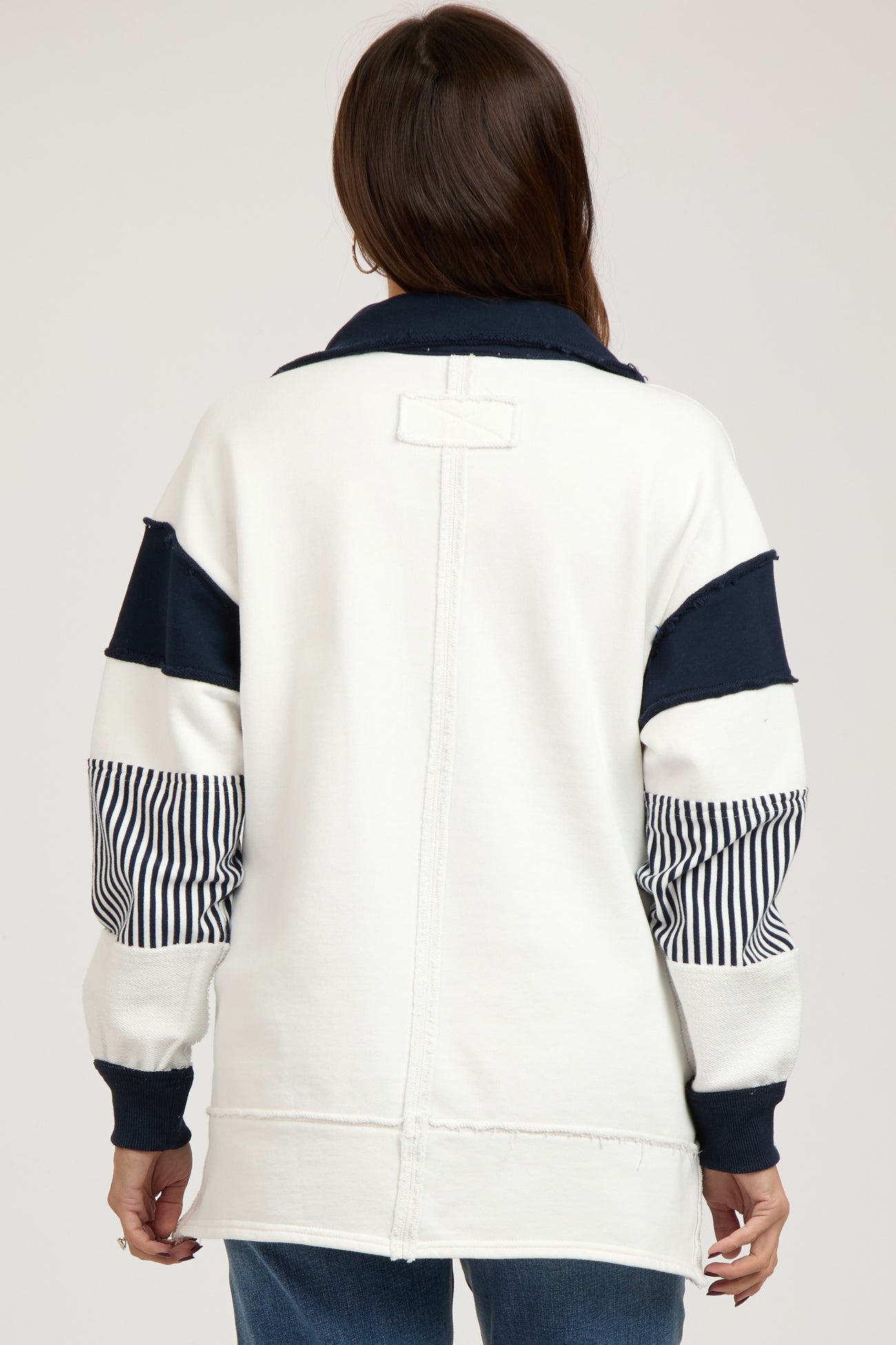 A colorblocked maternity sweater with a split v-neckline, a collar, long drop shoulder sleeves, and side slits at the hem. Features exposed seams.