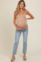 A French terry cloth maternity dress featuring a rounded neckline, cuffed short sleeves, side pockets, and a rounded hem.