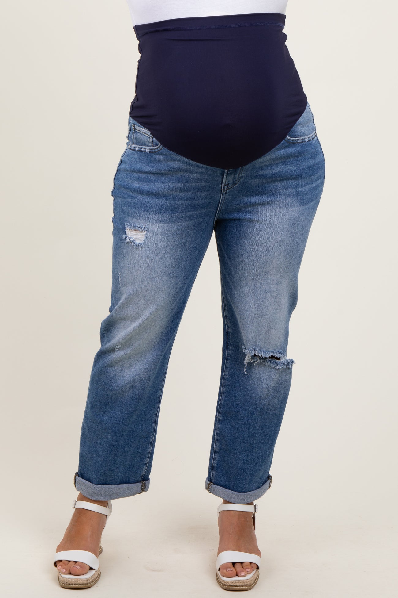 Navy Rolled Hem Distressed Straight Leg Maternity Plus Jeans