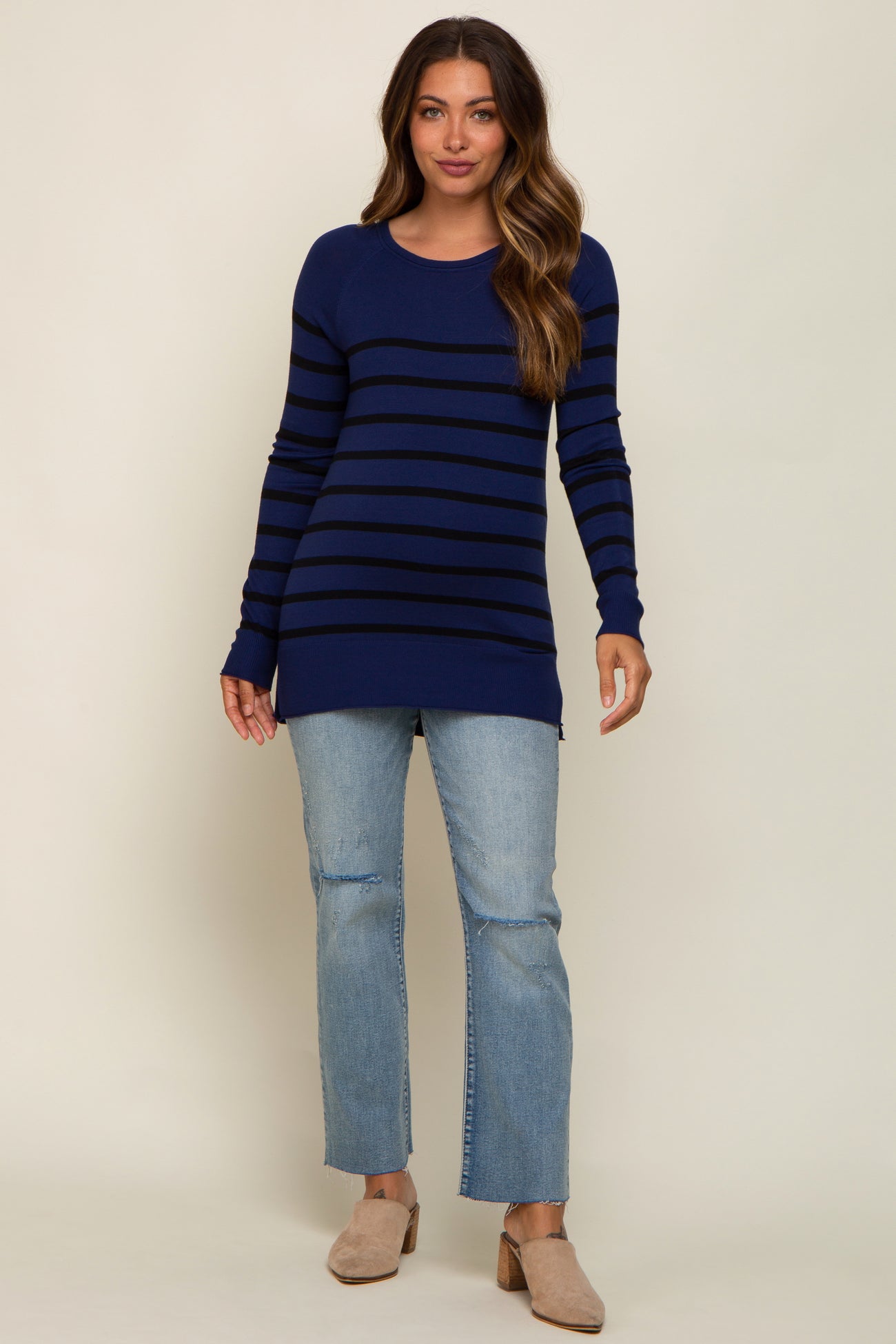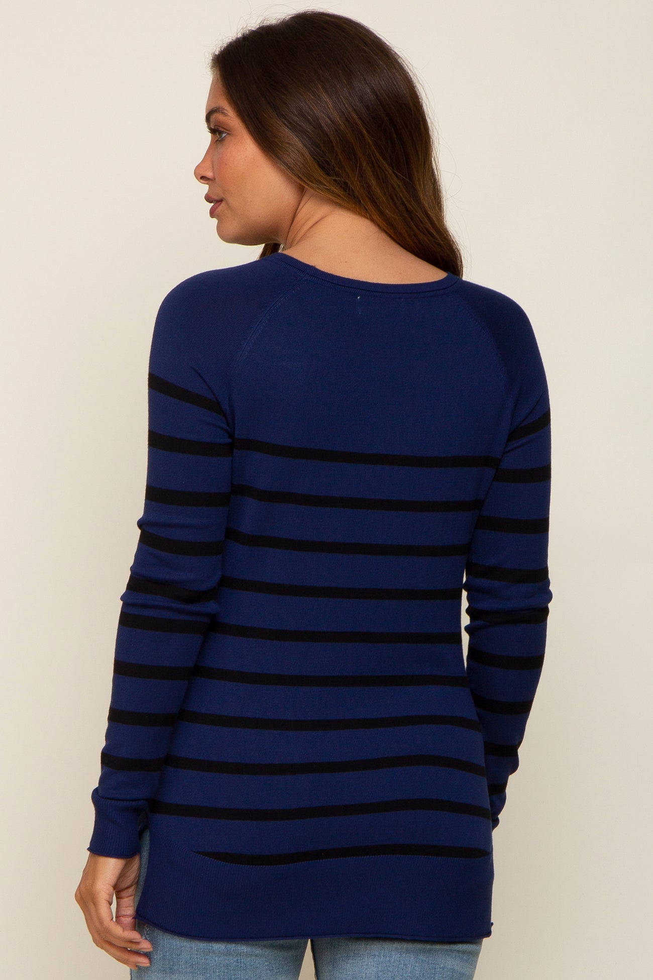 A knit striped maternity top featuring long sleeves, side slits and a rounded neckline.