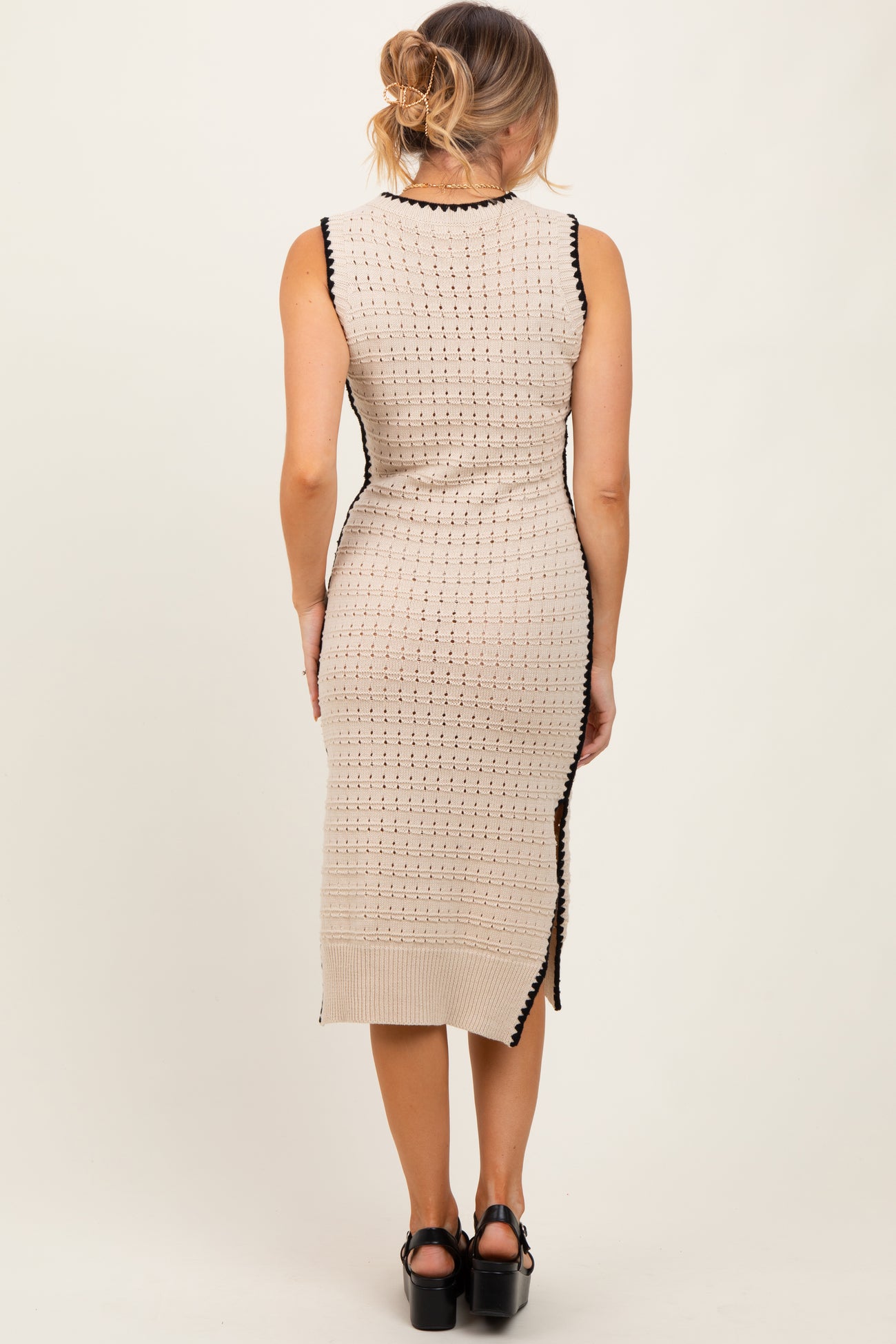Oatmeal Pointelle Contrast Trim Sweater Midi Dress
