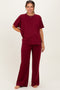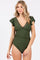 A solid hued swimsuit featuring a v-neckline, ruched sides, ruffle straps and back cutout.