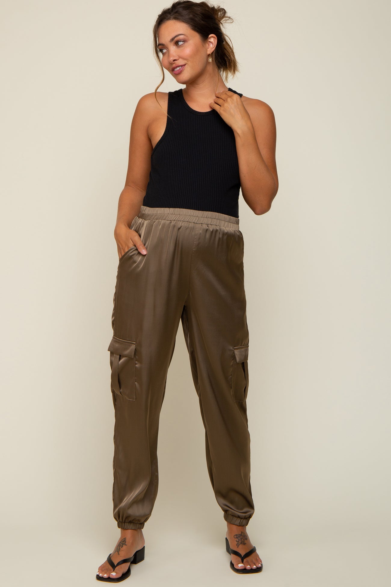 Details A satin maternity jogger pant with an elastic waistline, side pockets, and cargo pockets on the legs. Content + Care