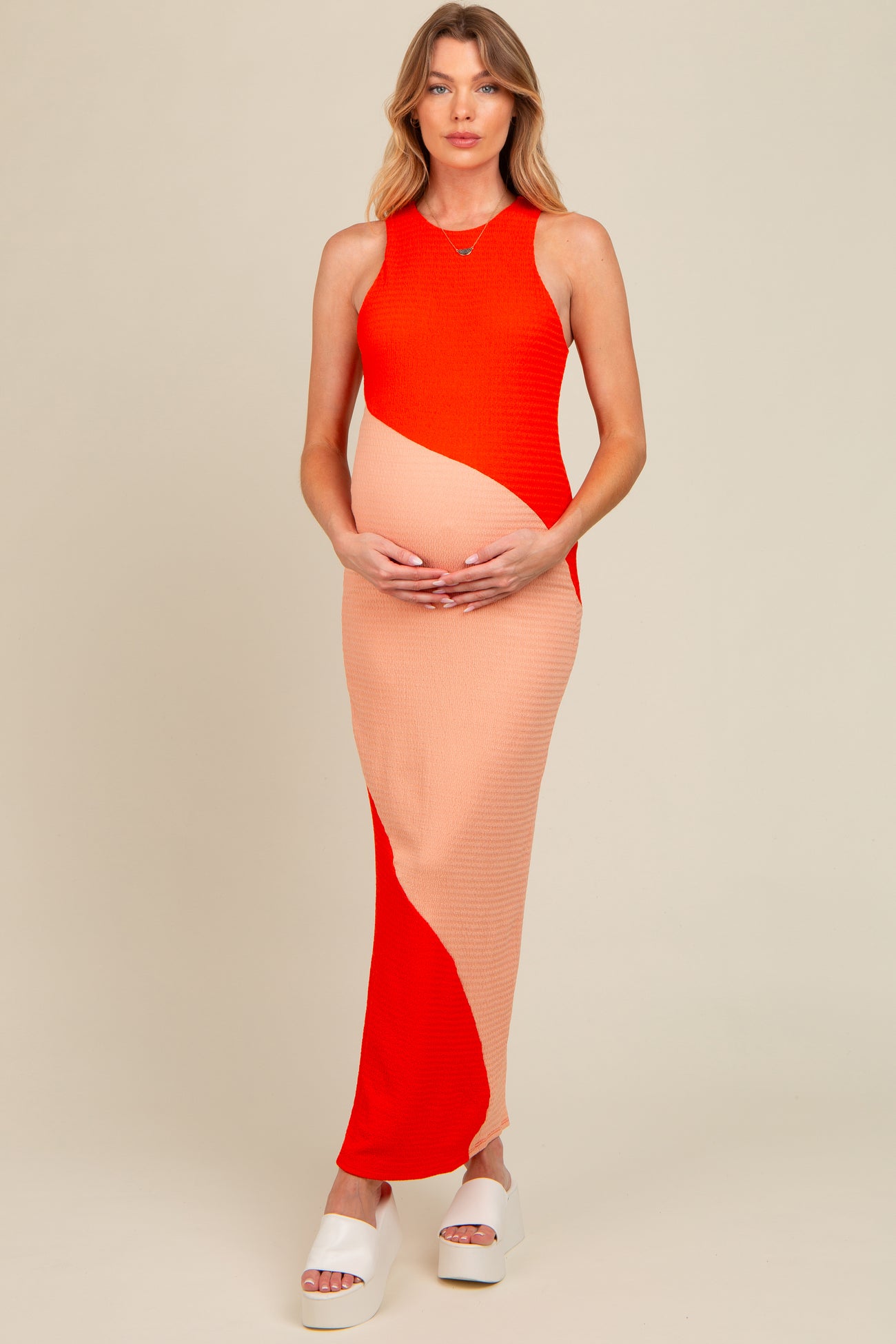 Orange Colorblock Fitted Maternity Maxi Dress