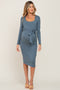 A floral dress with ruffle accents on the sleeves and hem featuring an elastic empire waist and button details.